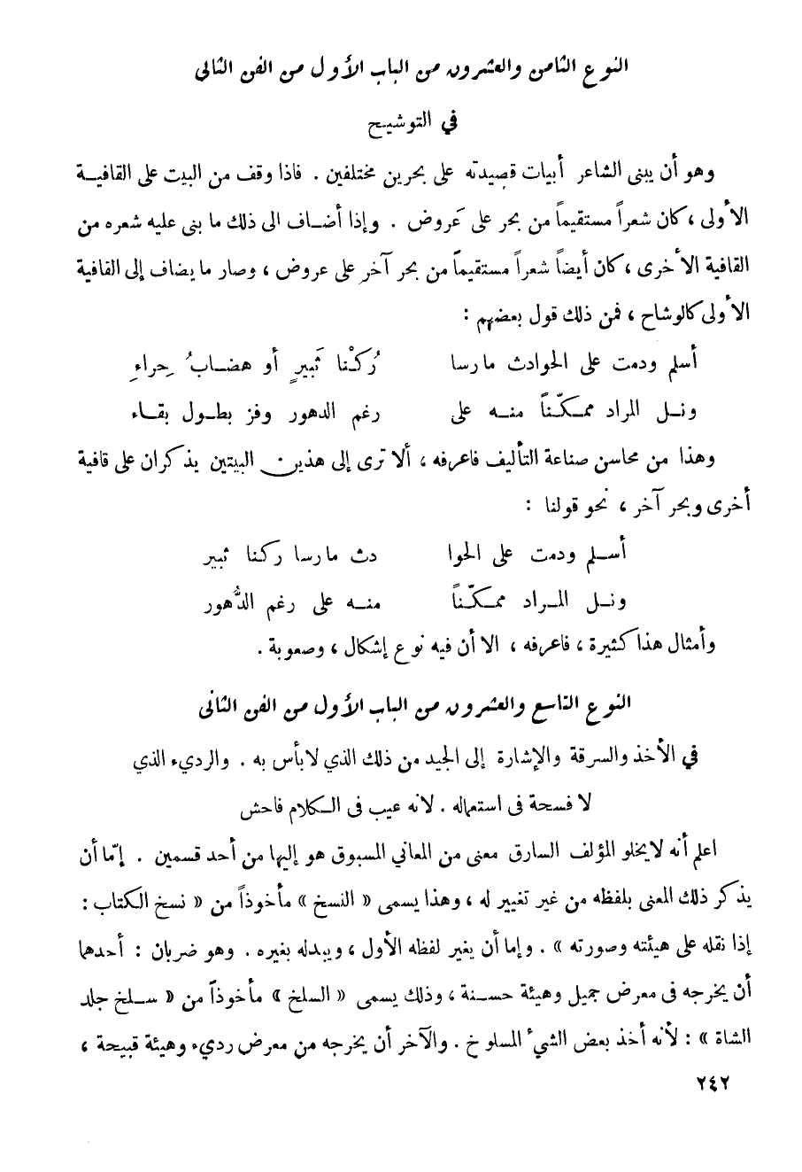 اعلم أنه لا يخلو المؤلف السارق معنى من المعاني المسبوق هو إليها من أحد قسمين. إما أن يذكر ذلك المعنى بلفظه من غير تغيير له، وهذا يسمى (النسخ) مأخوذاً من (نسخ الكتاب: إذا نقله على هيئته وصورته). وإما أن يغير لفظه الأول، ويبدله بغيره. وهو ضربان: أحدهما أن يخرجه في معرض جميل وهيئة حسنة، وذلك يسمى (السلخ) مأخوذاً من (سلخ جلد الشاة): لأنه أخذ بعض الشيء المسلوخ. والآخر أن يخرجه من معرض رديء وهيئة قبيحة،