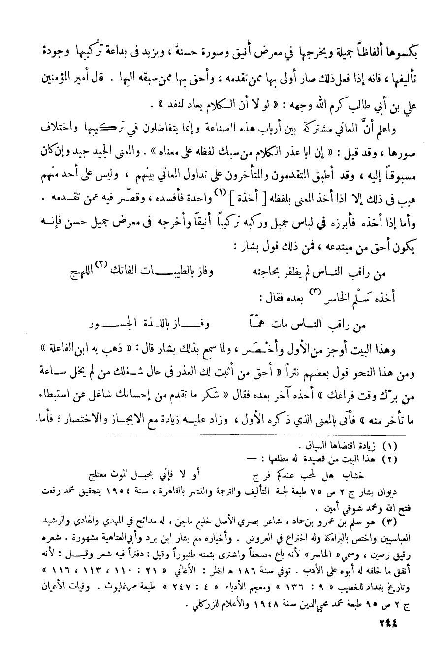 وهذا البيت أوجز من الأول وأخصر، ولما سمع بذلك بشار قال: (ذهب به ابن الفاعلة) ومن هذا النحو قول بعضهم نثراً (أحق من أثبت لك العذر في حال شغلك من لم يخل ساعة من برك وقت فراغك) أخذه آخر بعده فقال (شكر ما تقدم من إحسانك شاغل عن استبطاء ما تأخر منه) فأني بالمعنى الذي الأول، وزاد عليه زيادة مع الإيجاز والاختصار؛ فأما