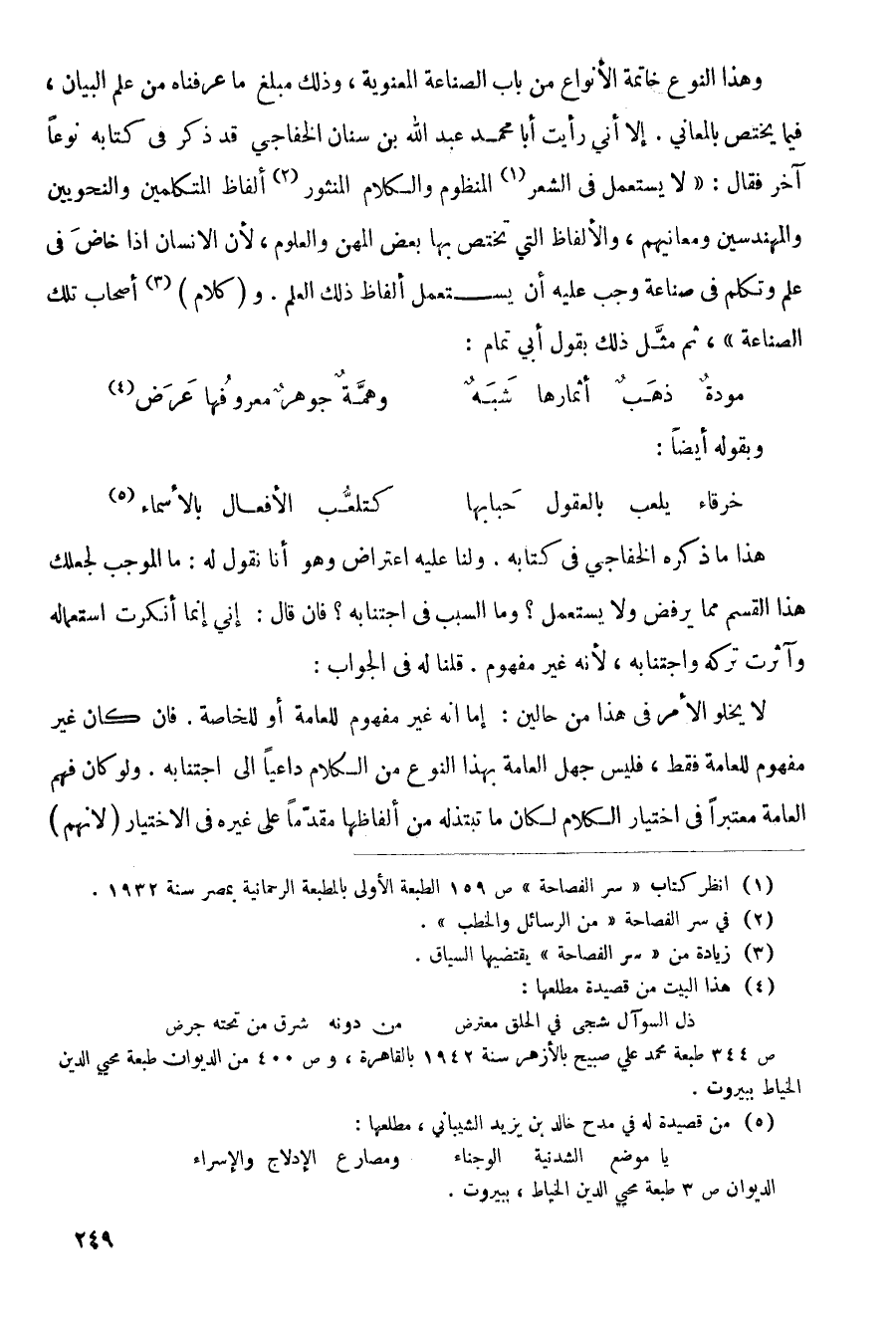 وهذا النوع خاتمة الأنواع من باب الصناعة المعنوية، وذلك مبلغ ما عرفناه من علم البيان، فيما يختص بالمعاني. إلا أني رأيت أبا محمد عبد الله بن سنان الخفاجي قد ذكر في كتابه نوعاً آخر فقال: (لا يستعمل في الشعر المنظوم والكلام المنثور ألفاظ المتكلمين والنحويين والمهندسين ومعانيهم، والألفاظ التي تختص بها بعض المهن والعلوم، لأن الإنسان إذا خاص في علم وتكلم في صناعة وجب عليه أن يستعمل ألفاظ ذلك العلم. و (كلام) أصحاب تلك الصناعة)، ثم مثل ذلك بقول