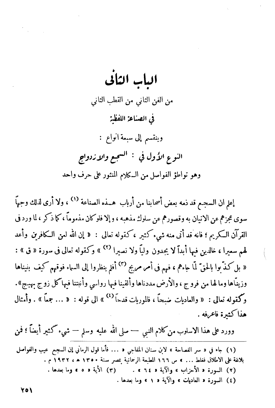 اعلم أن السجع قد ذمه بعض أصحابنا من أرباب هذه الصناعة، ولا أرى لذلك وجهاً سوى عجزهم عن الإتيان به وقصورهم عن سلوك مذهبه، وإلا فلو كان مذموماً، كما ذكر، لم ورد في القرآن الكريم؛ فإنه قد أتى منه شيء كثير، كقوله تعالى: (إن الله لمن الكافرين وأعد لهم سعيراً، خالدين فيها أبداً لا يجدون ولياً ولا نصيراً) وكقوله تعالى في سورة (ق): (بل كذبوا بالحق لما جاءهم، فهم في أمر مريج أفلم ينظروا إلى السماء فوقهم كيف بنيناها وزيناها وما لها من فروج، والأرض مددناها وألقينا فيها رواسي وأنبتنا فيها كل زوج بهيج). وكقوله تعالى: (والعاديات ضبحاً، فالموريات قدحاً) إلى قوله: (. . . جمعاً). ومثال ذلك هذا كثيرة فاعرفه.