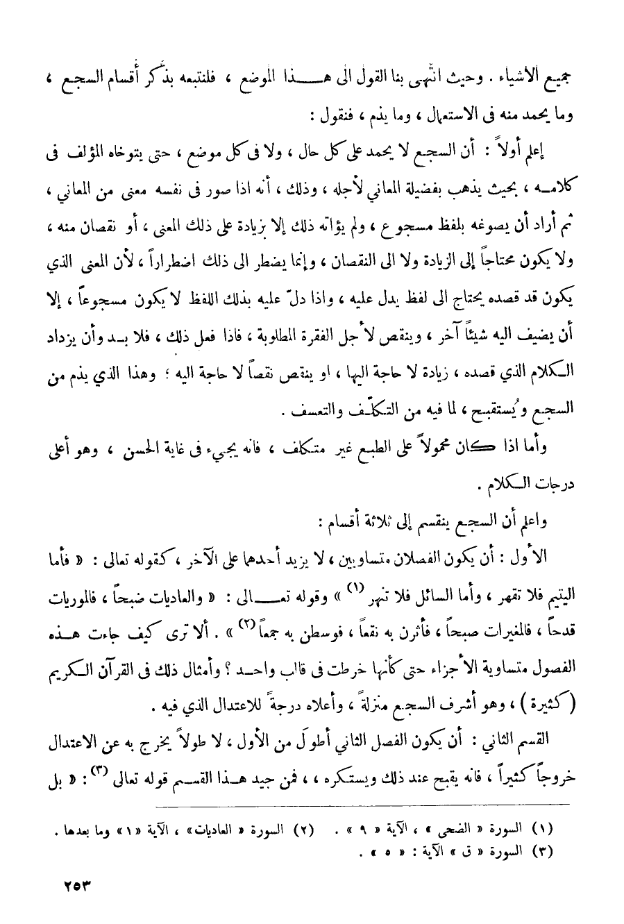 جميع الأشياء. وحيث أنهى بنا القول إلى هذا الموضع، فلنتبعه بذكر أقسام السجع، وما يحمد منه في الاستعمال، وما يذم، فنقول: