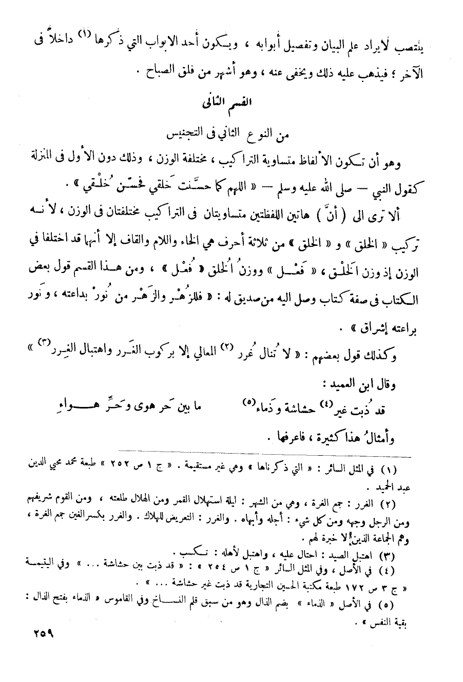 ألا ترى إلى (أن) هاتين اللفظتين متساويتان في التراكيب مختلفتان في الوزن، لأنه تركيب (الخلق) و (الخلق) من ثلاثة أحرف هي الخاء واللام والقاف إلا أنهما قد اختلفا في الوزن إذ وزن الخلق، (فعل) ووزن الخلق (فعل)، ومن هذا القسم قول بعض الكتاب في صفة كتاب وصل إليه من صديق له: (فللزهر والزهر من نور بداعته، ونور براعته إشراق).