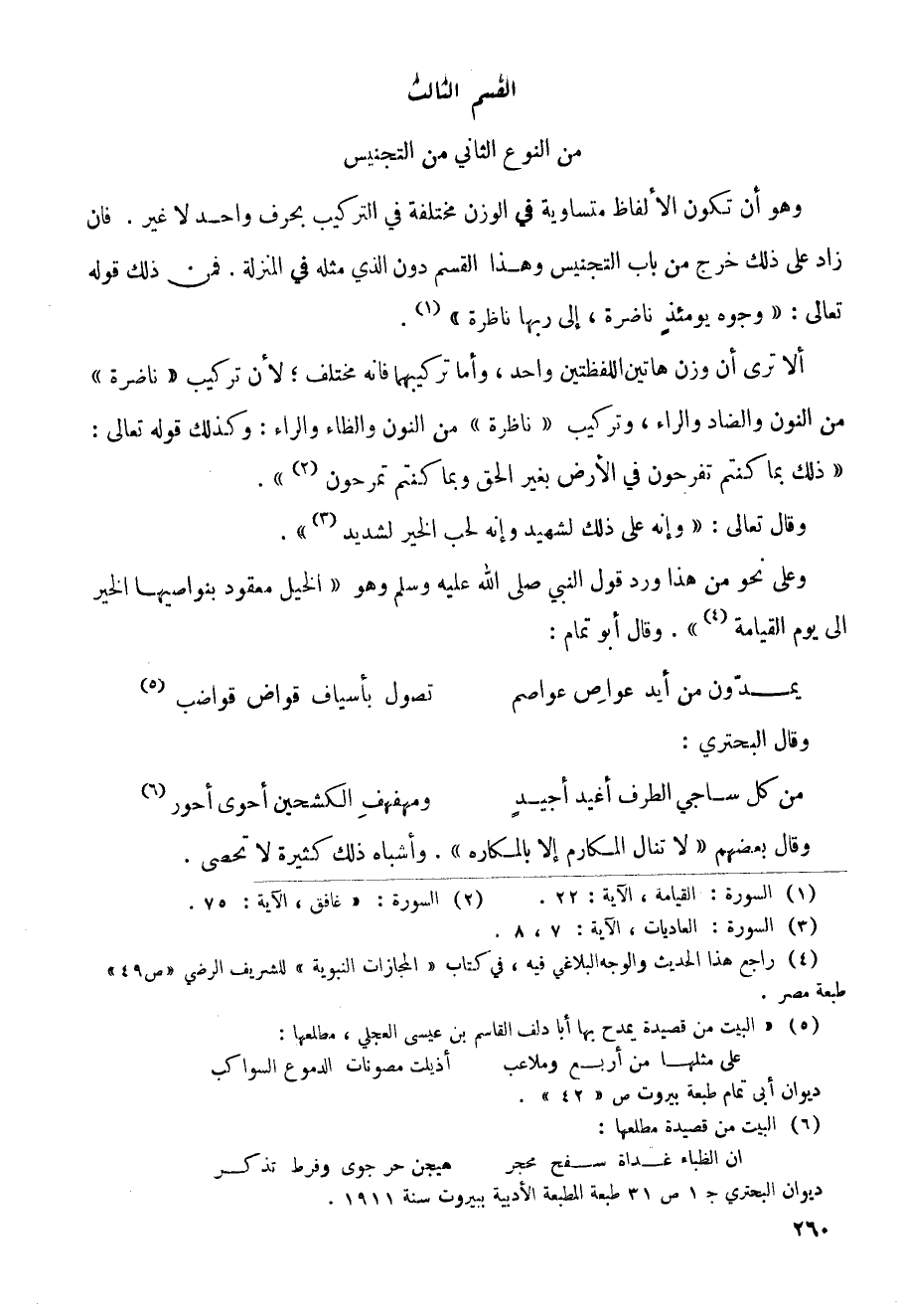 ألا ترى أن وزن هاتين اللفظين واحد، وأما تركيبها فانه مختلف؛ لأن تركيب (ناضرة) من النون والضاد والراء، وتركيب (ناظرة) من النون والظاء والراء: وكذلك قوله تعالى: (ذلك بما كنتم تفرحون في الأرض بغير الحق وبما كنتم تمرحون).