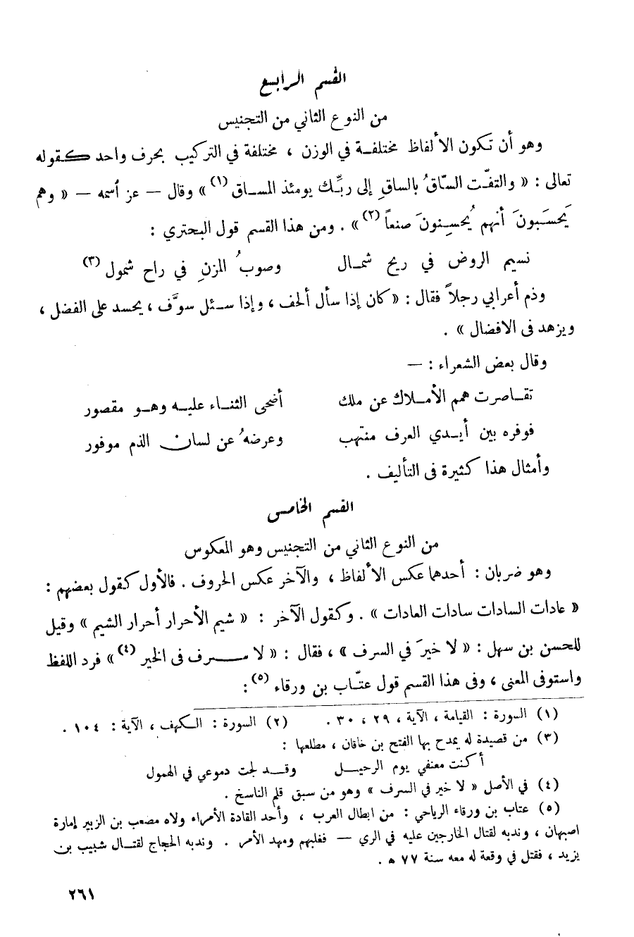 وهو ضربان: أحدهما عكس الألفاظ، والآخر عكس الحروف. فالأول كقول بعضهم: (عادات السادات سادات العادات). وكقول الآخر: (شيم الأحرار أحرار الشيم) وقيل للحسن بن سهل: (لا خيرَ في السرف)، فقال: (لا سرف في الخير) فرد اللفظ واستوفى المعنى، وفي هذا القسم قول عتّاب بن ورقاء:
