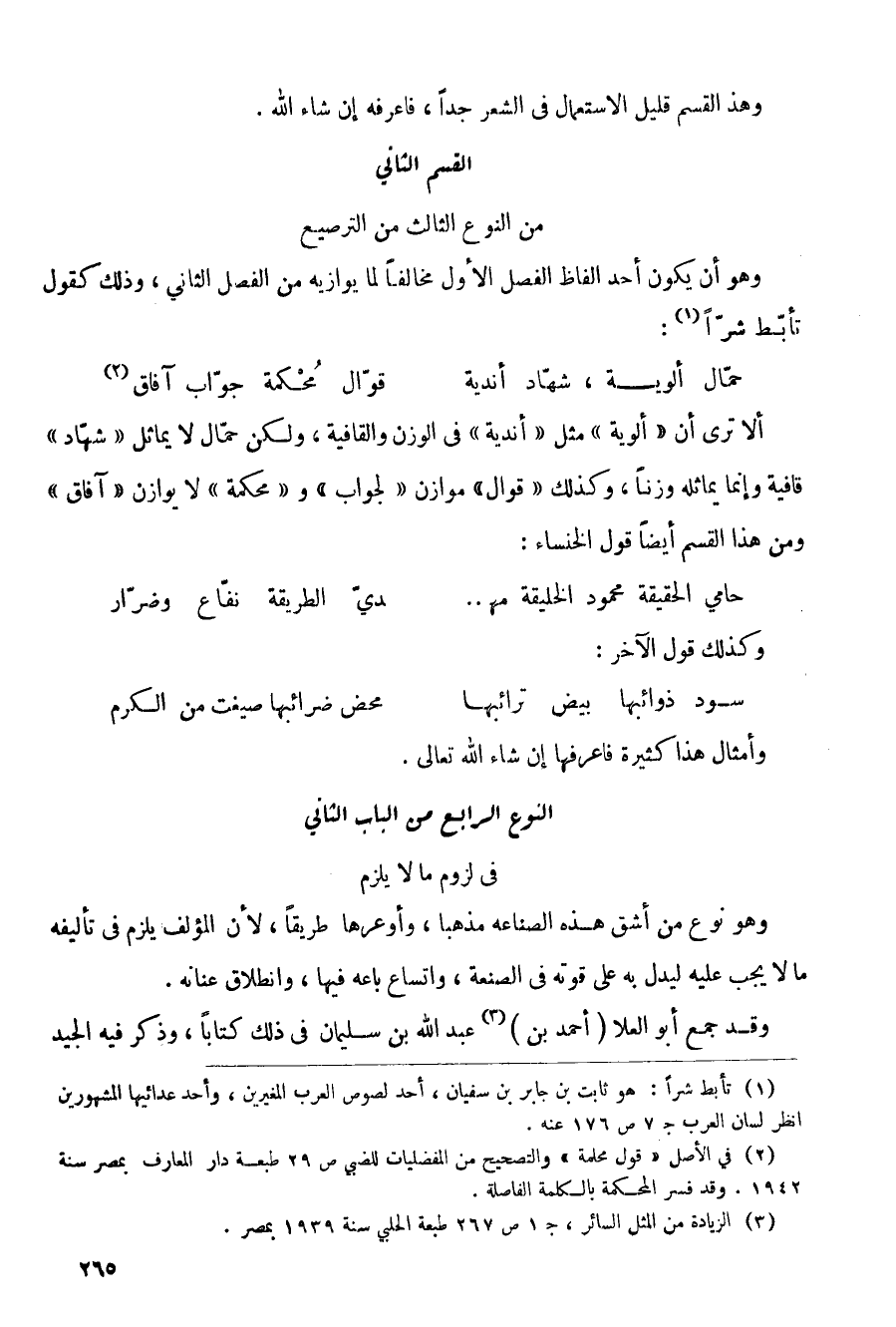 ألا ترى أن (ألوية) مثل (أندية) في الوزن والقافية، ولكن حمال لا يماثل (شهّاد) قافية وإنما يماثله وزناً، وكذلك (قوال) موازن (لجواب) و (محكمة) لا يوازن (آفاق) ومن هذا القسم أيضاً قول الخنساء:
