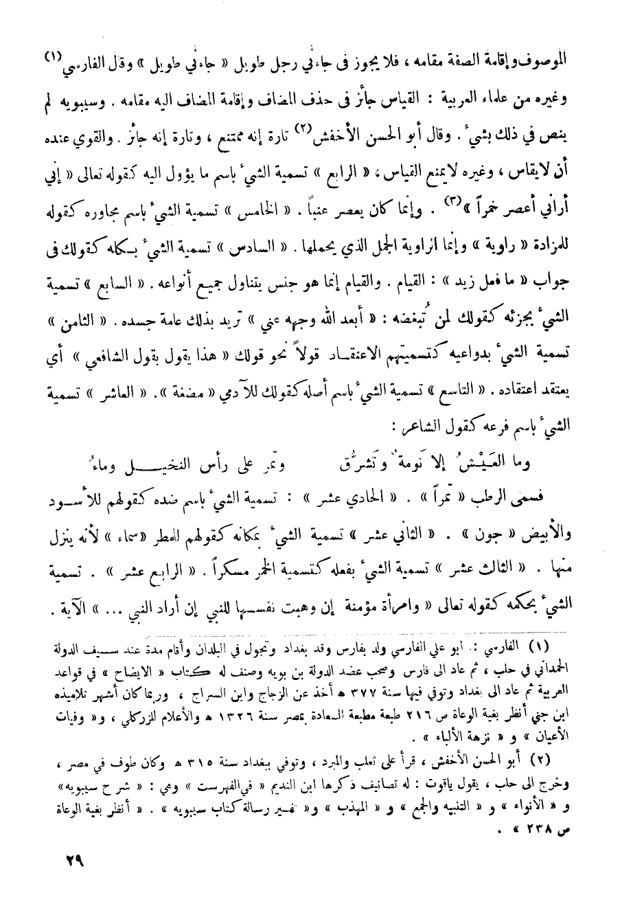 فسمى الرطب (تمراً). (الحادي عشر): تسمية الشيء باسم ضده كقولهم للأسود والأبيض (جون). (الثاني عشر) تسمية الشيء بمكانه كقولهم للمطر (سماء) لأنه ينزل منها. (الثالث عشر) تسمية الشيء بفعله كتسمية الخمر مسكراً. (الرابع عشر). تسمية الشيء بحكمه كقوله تعالى (وامرأة مؤمنة إن وهبت نفسها للنبي إن أراد النبي. . .) الآية.