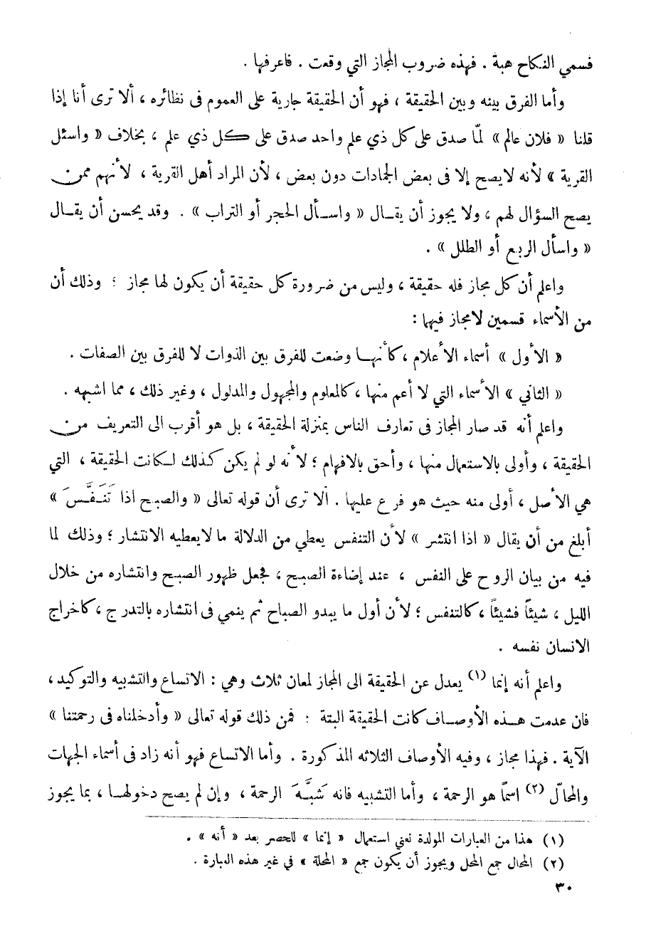 واعلم إنه قد صار المجاز في تعارف الناس بمنزلة الحقيقة، بل هو أقرب إلى التعريف من الحقيقة، وأولى بالاستعمال منها، وأحق بالافهام؛ لأنه لو لم يكن كذلك لكانت الحقيقة، التي هي الأصل، أولى منه حيث هو فرع عليها. ألا ترى أن قوله تعالى (والصبح إذا تنفس) أبلغ من أن يقال (إذا انتشر) لأن التنفس يعطي من الدلالة ما لا يعطيه الانتشار؛ وذلك لما فيه من بيان الروح على النفس، عند إضاءة الصبح، فجعل ظهور الصبح وانتشاره من خلال الليل، شيئاً فشيئاً، كالتنفس؛ لأن أول ما يبدو الصباح ثم ينمي في انتشاره بالتدرج، كإخراج الإنسان نفسه.