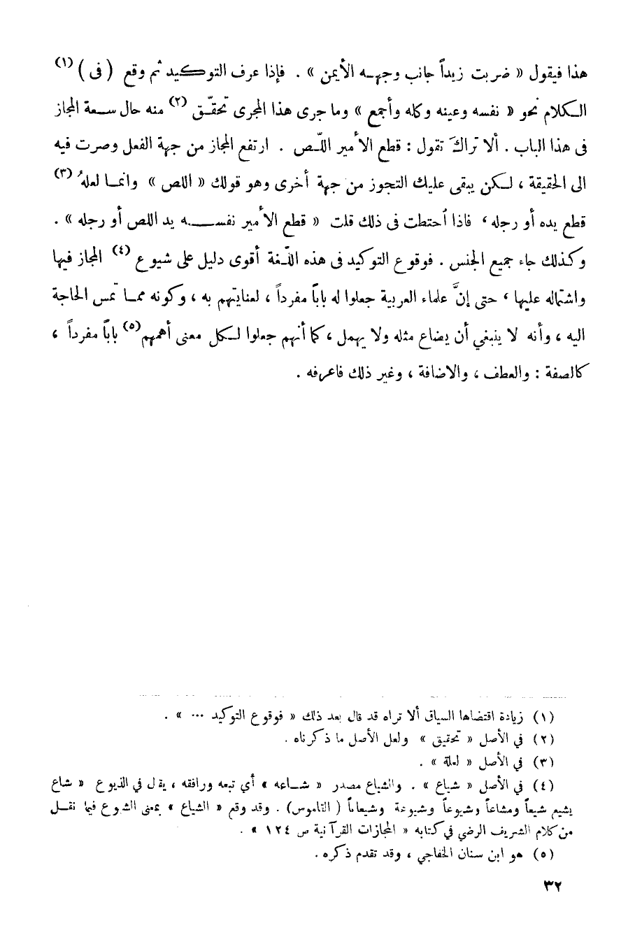 الأمير اللص. ارتفع المجاز من جهة الفعل وصرت فيه إلى الحقيقة، لكن يبقى عليك التجوز من جهة أخرى وهو قولك (اللص) وإنما لعله قطع يده أو رجله، فإذا احتطت في ذلك قلت (قطع الأمير نفسه يد اللص أو رجله). وكذلك جاء جميع الجنس، فوقوع التوكيد في هذه اللغة أقوى دليل على شيوع المجاز فيها واشتماله عليها، حتى إن علماء العربية جعلوا له باباً مفرداً، لعنايتهم به، وكونه مما تمس الحاجة إليه، وأنه لا ينبغي إن يضاع مثله ولا يهمل، كما أنهم جعلوا لكل معنى أهمهم باباً مفرداً، كالصفة: والعطف، والإضافة، وغير ذلك فاعرفه.