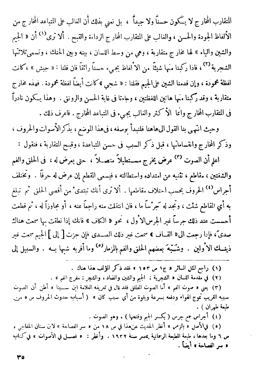 اعلم أن الصوت عرض يخرج مستطيلاً متصلاً، حتى يعرض له، في الحلق والفم والشفتين، مقاطع، تثنيه عن امتداده واستطالته، فيسمى المقطع إن عرض له حرفاً. وتختلف أجراس الحروف يحسب اختلاف مقاطعها. ألا ترى أنك تبتديْ من أقصى الحلق ثم تبلغ به أي المقاطع شئت، وتجد له جرساً ما، فإن انتقلت منه راجعاً عنه، أو مجاوزاً له، ثم قطعت أحسست عند ذلك جرساً غير الجرس الأول، نحو (الكاف) فانك إذا نطقت بها سمعت هناك صدى، فإذا رجعت إلى (القاف) سمعت غير ذلك الصدى فإن جزت (إلى) الجيم سمعت غير ذينك الأولين. وشبه بعضهم الحلق والفم بالمزمار وما أقريه شبها به. والسبيل إلى
