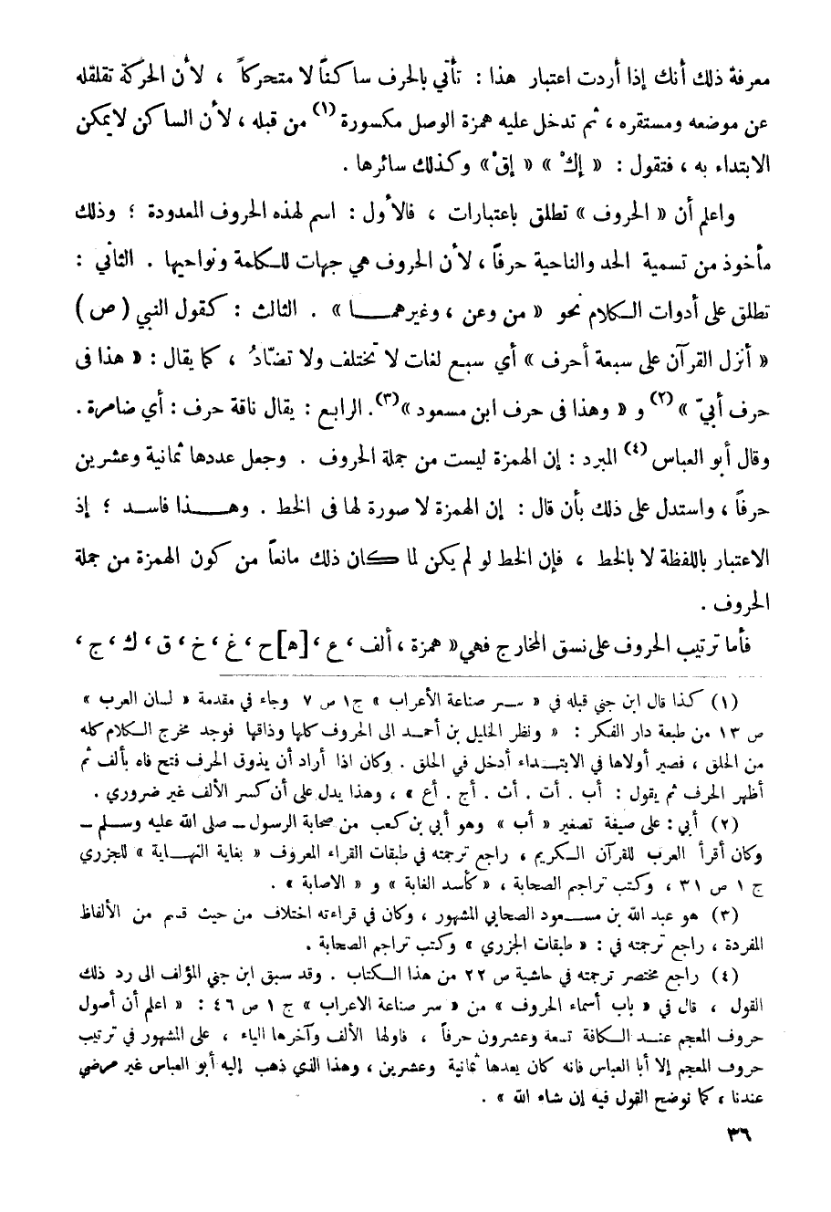 واعلم أن (الحروف) تطلق باعتبارات، فالأول: اسم لهذه الحروف المعدودة؛ وذلك مأخوذ من تسمية الحد والناحية حرفاً، لأن الحروف هي جهات للكلمة ونواحيها. الثاني: تطلق على أدوات الكلام نحو (من وعن، وغيرهما). الثالث: كقول النبي (ص) (أنزل القرآن على سبعة أحرف) أي سبع لغات لا تختلف ولا تضاد، كما يقال: (هذا في حرف أبي) و (وهذا في حرف ابن مسعود). الرابع: يقال ناقة حرف: أي ضامرة. وقال أبو العباس المبرد: إن الهمزة لا صورة لها في الخط. وهذا فاسد؛ إذ الاعتبار باللفظة لا بالخط، فإن الخط لو لم يكن لما كان ذلك مانعاً من كون الهمزة من جملة الحروف.