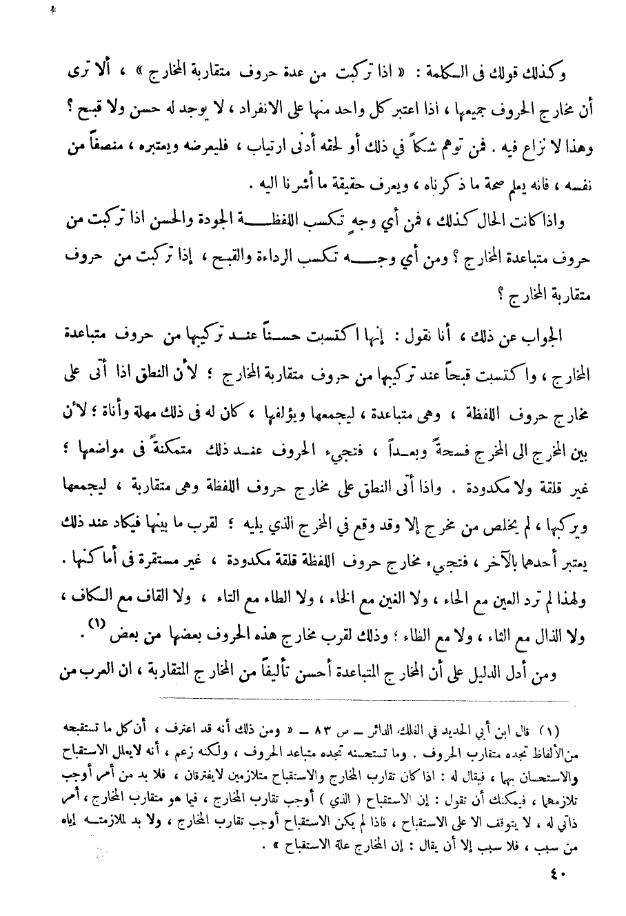 وكذلك قولك في الكلمة: (إذا تركيب من عدة حروف متقاربة المخارج)، ألا ترى أن مخارج الحروف جميعها، إذا اعتبر كل واحد منها على الانفراد، لا يوجد له حسن ولا قبح؟ وهذا لا نزاع فيه. فمن توهم شكاً في ذلك أو لحقه أدني ارتياب، فليعرضه ويعتبره، منصفاً من نفسه، فإنه يعلم صحة ما ذكرناه، ويعرف حقيقة ما أشرنا إليه.