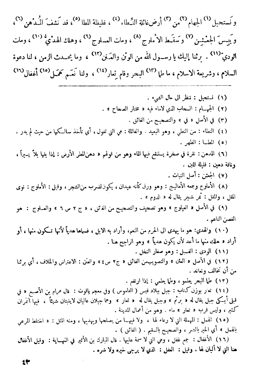 ونستحيل الجهام من أرض غائلة النطاء، غليظة المطا، قد نشف المدهن، ويبس الجعثن وسقط الأملوج، ومات العسلوج، وهلك الهدي، ومات الودي. برئنا إليك يا رسول الله من الوثن والعنن، وما يحدث الزمن، لنا دعوة السلام، وشريعة الإسلام، ما طما البحر وقام تعار، ولنا نعم همل أغفال