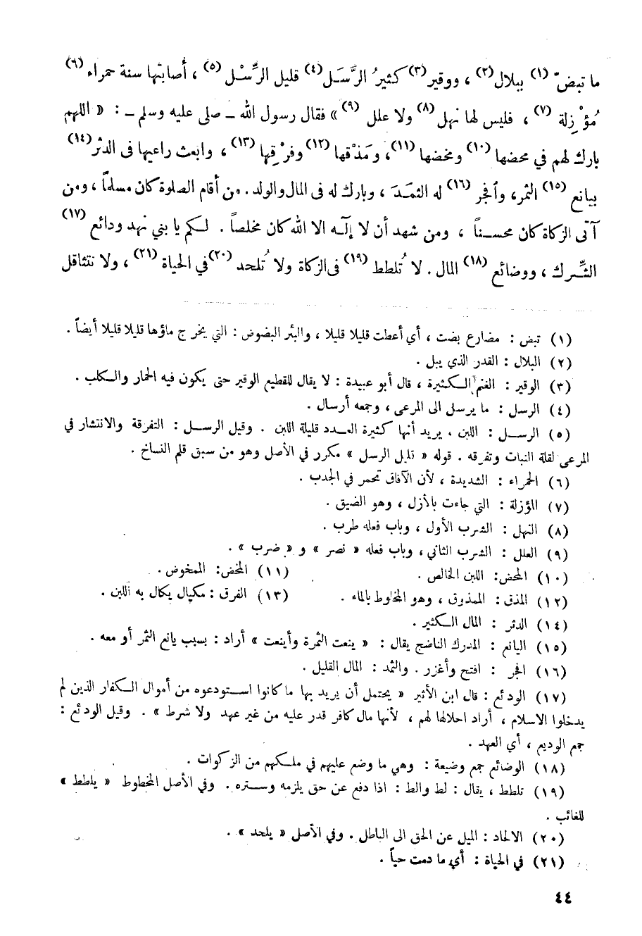 ما تبض ببلال، ووقير كثير الرسل قليل الرسل، أصابتها سنة حمراء مؤزلة، فليس لها نهل ولا علل) فقال رسول الله - صلى الله عليه وسلم -: (اللهم بارك لهم في محضها ومخضها، ومذقها وفرقها، وابعث راعيها في الدثر بيانع الثمر، وأفجر له الثمد، وبارك له في المال والولد. من أقام الصلوة كان