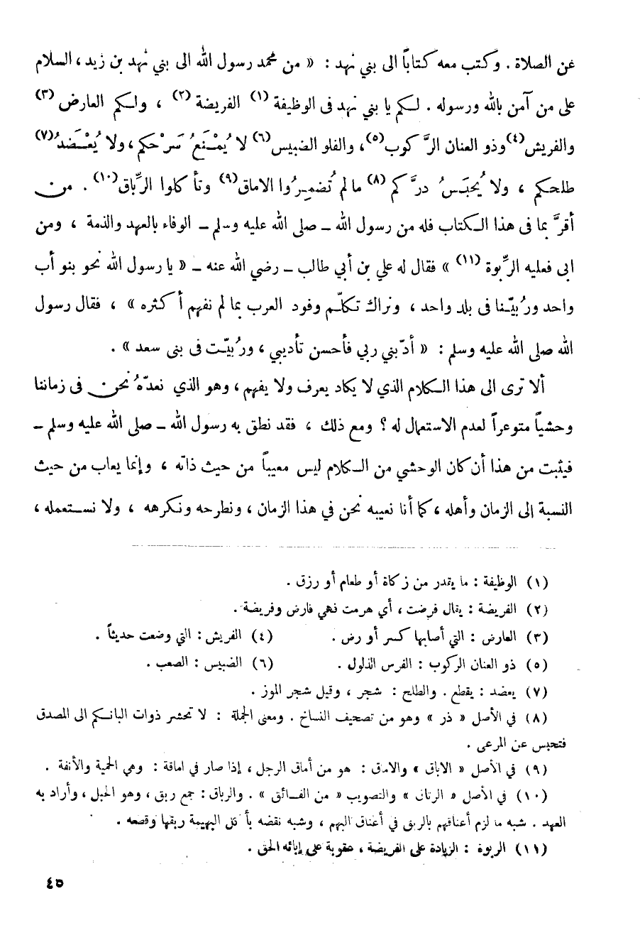 عن الصلاة). وكتب معه كتاباً إلى بني نهد: (من محمد رسول الله إلى بني نهد بن زيد، السلام على من آمن بالله ورسوله. لكم يا بني نهد في الوظيفة الفريضة، ولكم العارض والفريش وذو العنان الركوب، والفاو الضبيس لا يمنع سرحكم، ولا يعضد طلحكم، ولا يحبس در كم ما لم تضمروا الاماق وتأكلوا الرباق. من أقر بما في هذا الكتاب فله من رسول الله - صلى الله عليه وسلم - الوفاء بالعهد والذمة، ومن أبى فعليه الربوة) فقال له علي بن أبي طالب - رضي الله عنه - (يا رسول الله نحو بنو أب واحد وربينا في بلد واحد، وتراك تكلم وفود العرب بما لم نفهم أكثره)، فقال رسول الله صلى الله عليه وسلم: (أدبني ربي فأحسن تأديبي، وربيت في بني سعد).