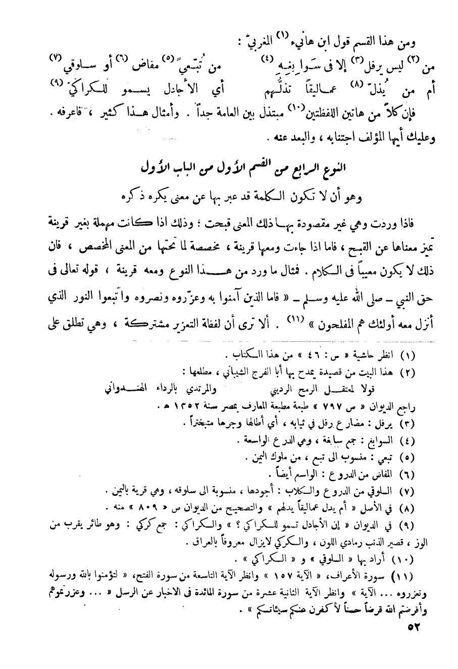 فإذا وردت وهي غير مقصودة بها ذلك المعنى قبحت؛ وذلك إذا كانت مهملة بغير قرينة تميز معناها عن القبح، فأما إذا جاءت ومعها قرينة، مخصصة لما تحتها من المعنى المخصص، فإن ذلك لا يكون معيباً في الكلام. فمثال ما ورد من هذا النوع ومعه قرينة، قوله تعالى في حق النبي - صلى الله عليه وسلم - (فأما الذين آمنوا به وعزروه ونصروه واتبعوا النور الذي أنزل معه أولئك هم المفلحون). ألا ترى أن لفظة التعزير مشتركة، وهي تطلق على