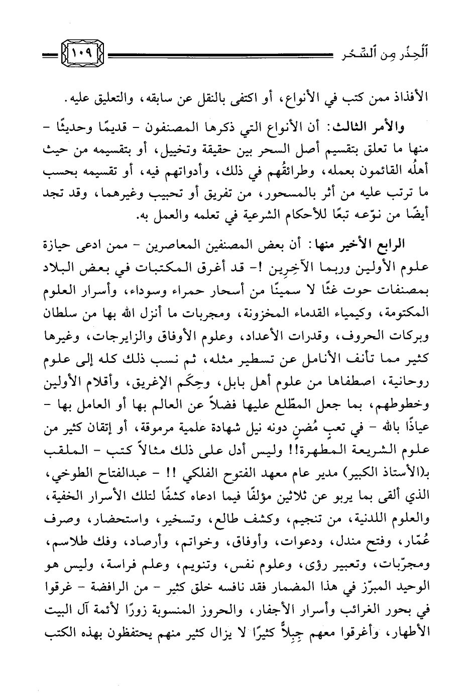 [ولما كانت المرتبتان الأُولَيَان من السحر لها حقيقة في الخارج، والمرتبة الأخيرة الثالثة لا حقيقة لها؛ اختلف العلماء في السحر، هل هو حقيقة أو إنما هو تخييل، فالقائلون بأن له حقيقة نظروا إلى المرتبتين الأولَيَيْن، والقائلون بأنْ لا حقيقة له نظروا إلى المرتبة الثالثة الأخيرة، فليس بينهم اختلاف في نفس الأمر، بل إنما جاء من قِبَل اشتباه هذه المراتب، والله أعلم] (¬3) . وعلى ذلك يكون ابن خلدون رحمه الله قد جعل أصولاً عامة يمكن أن يندرج تحتها صنوفًا تكاد ألا تحصى من أنواع السحر، قد تشعّب في ذكرها بعض أهل العلم. وإذا جاز لنا إجمال مذهبه - بما ييسر فقه ذلك على القارئ - فإن ذلك منحصر في ستة أمور: