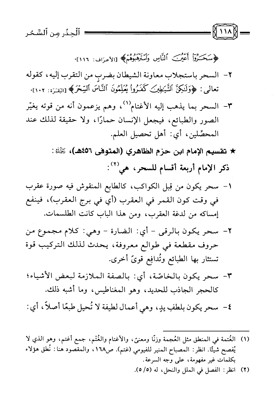 (¬3) انظر: تفسير ابن كثير ص 131، ط - بيت الأفكار. وقول الإمام: مخالطة النيران ومسك الحيات، فإن طريقتهم في ذلك أن يعمد أحدهم إلى دُهن خاص يدّهن به، فيحجز ذلك عنه أثر النار أو لسع الحيات. وقوله رحمه الله: من المحالات، المقصود به: في الأحوال العادية غير الخارقة، أو من المُحال في حق هؤلاء الدجاجلة من غير استعانتهم بتلك الخواص للمواد، والله أعلم.