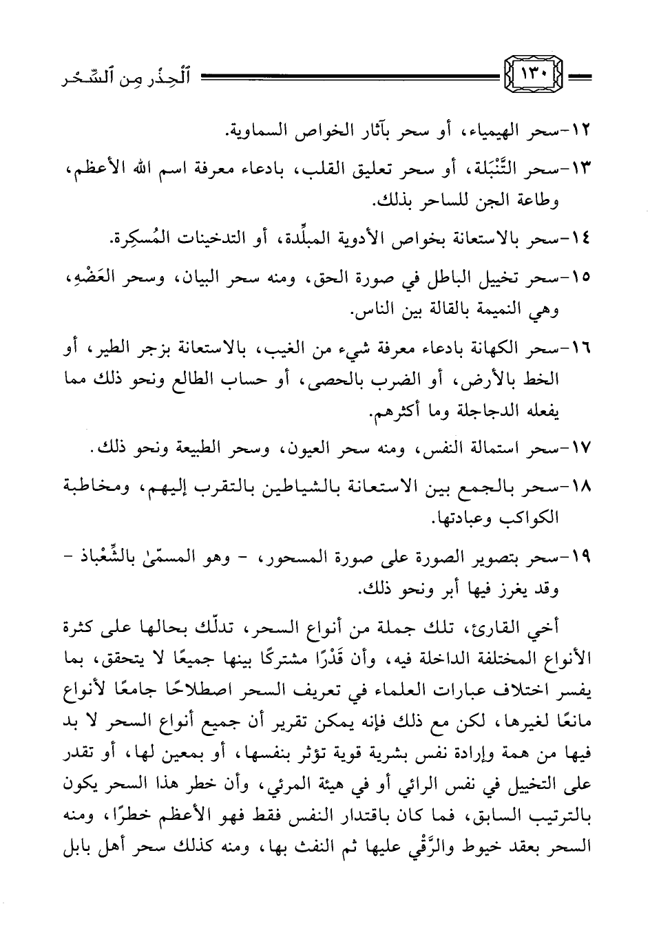 3- سحر التخييل، وقد سبق بيانه، وأنه على ضربين؛ إما بالتأثير في القوى المتخيِّلة للرائي وهي التي تكون في نفسه، أي: بالتأثير المعنوي والإيحاء لهذه القوى بصور يريدها الساحر، أو بالتأثير في قوة الإبصار المحسوسة بالاعتماد على أخطاء البصر بصرفه إلى مُبصَر معين حتى إذا حدّق فيه انصرف عن غيره، أو بإمهال البصر زمنًا غير كاف فيُشكِل عليه