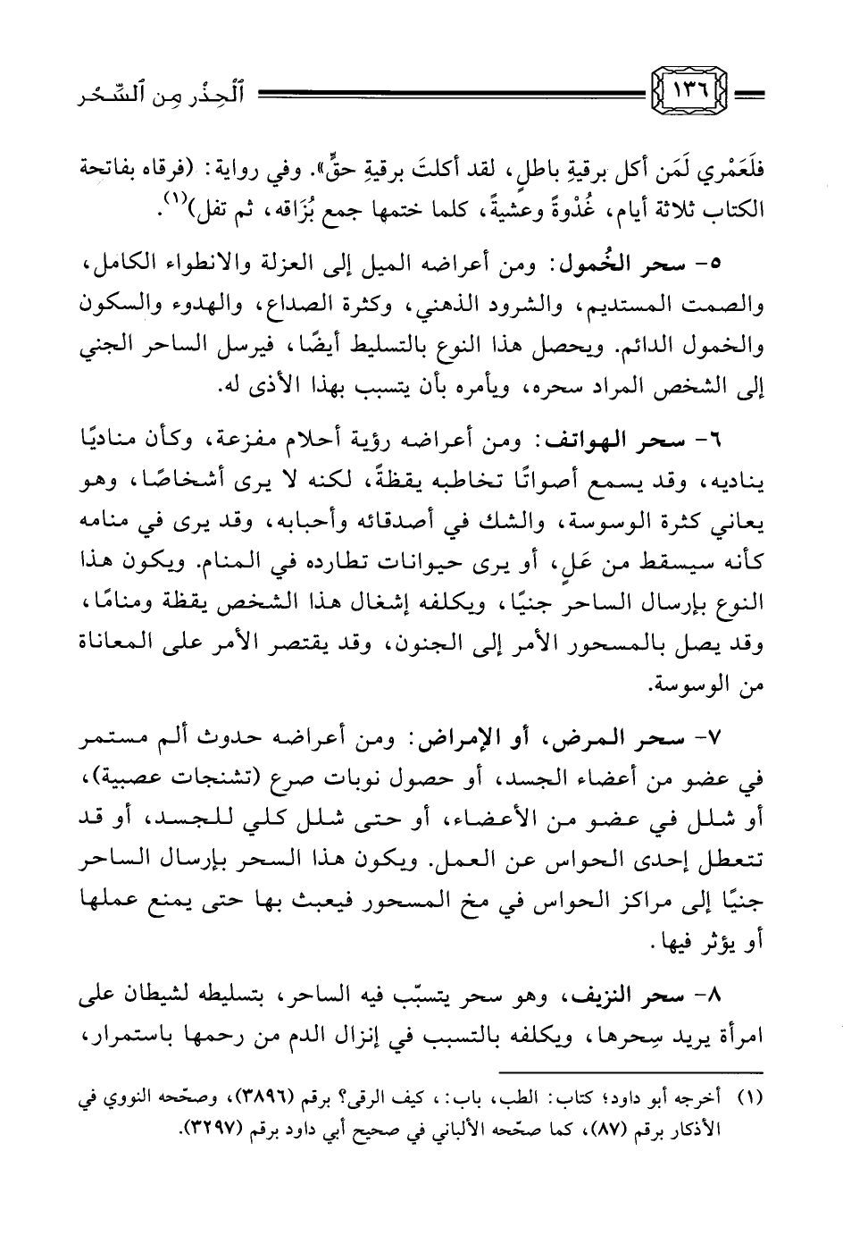 9- سحر تعطيل الزواج، ومن أعراضه صداع بين الحين والآخر، وضيق شديد في الصدر، ورؤية كل خاطب بمنظر قبيح، مع كثرة الشرود الذهني، والقلق في أثناء النوم، وقد يصاحب ذلك ألم دائم في المعدة أو في فقرات الظهر، وسبيله أن يوكل الساحر جنيًا بحجز فتاة عن الزواج، فيلازمها، فيؤثر فيها بحيث تنفر من كل زوج يتقدم لخطبتها، أو يلقي في القوة المتخيِّلة عند الخاطب صورة قبيحة لتلك الفتاة فلا يرغب بخطبتها، وقد يخيل ذلك للفتاة أيضًا فترى كل خاطب لها بصورة قبيحة. ولو فرض أن تقدم لها خاطب فإنه سرعان ما يتراجع عن ذلك بفعل وسوسة ذلك الجني له. وفي حالات سحر التعطيل تجد الرجل الخاطب يشعر بضيق شديد إذا ما تخطى عتبة دار المخطوبة، وكأنه في سجن يتطلع بشوق للخروج منه.