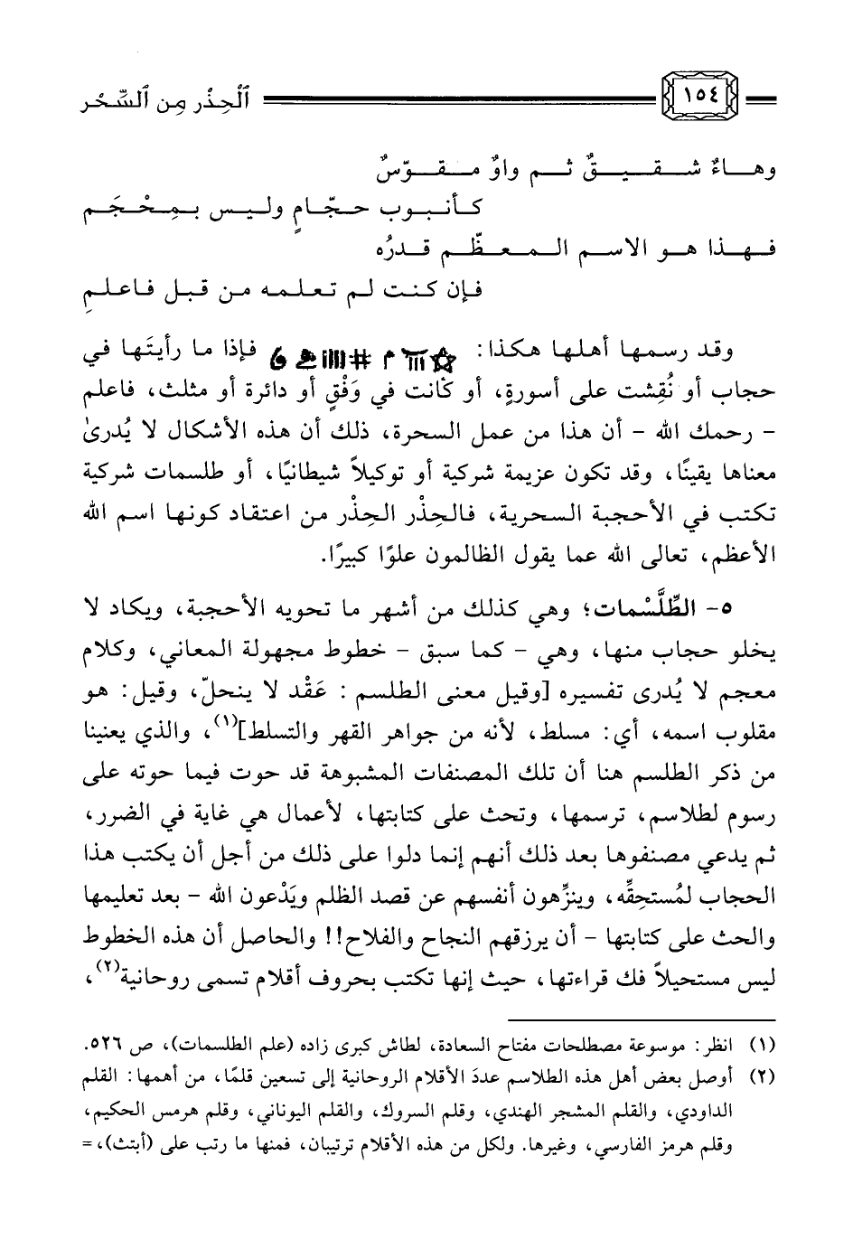 هذا، وقد وردت تفسيرات لهذه الأشكال لا إسناد لها يعتد به، فهي ضروب من التخرص في تأويل ذلك، ومنها أن الخاتم ذا الأركان خمسة، يشير إلى التطواف بأركان الملكوت. وأن الألِفات الثلاثة ترمز إلى الجمع لمعنى الشفع والوتر، والألف الممدود فوقها دل على كمال القهر والغلبة، والألفات الأربع لكل ذي قوائم أربع، والميم المنطمسة دلت على انطماسها بمداد العُبَّاد والعلماء والزُّهاد، والسُّلَّم يعني معراج السموات السبع الطباق، والهاء المقوسة تدل على إحاطة العلم والأمر. وثمة تأويلات أخرى نضرب صفحًا عن ذكرها، ولا ندخل في اختلافات أهلها بها فقد صرح كبيرهم البوني في منبع أصول الحكمة بما نصه (¬1) : وأما الأحرف السبعة التي هي.............. فاختلف الحكماء في معانيها على أقوال كثيرة، والحق أنها من غوامض الأسرار التي لا ينبغي التصريح بها حتى يكشفه الله تعالى للطالب إلهامًا أو منامًا!! فلينتظر منتظرهم كشفًا أعظم بإلهام أو بمنام، ونحن ننتظر رحمة الله باتباع رسوله خير الأنام صلى الله عليه وسلم.