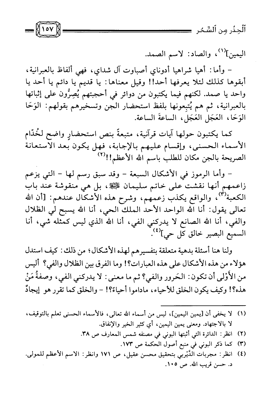 خسرانه عند إرباح العالمين ونُسِخ اسمه من لوح المقربين ... ] . انظر - رحمني الله وإياك - هل بعد هذه العبارات من تجرؤ على دين الله؟! فكتاب البوني موصوف عنده بوصف القرآن العظيم، ومعظَّم لديه تعظيمَ بيت الله العتيق، ومن لا يقرّ بذلك يتولى البوني الحكم عليه بنفسه يوم الدين بالخسران المبين، ونسخ اسمه من لوح الأبرار في علّيين!!! كما وطرده من ملأ المقربين!!