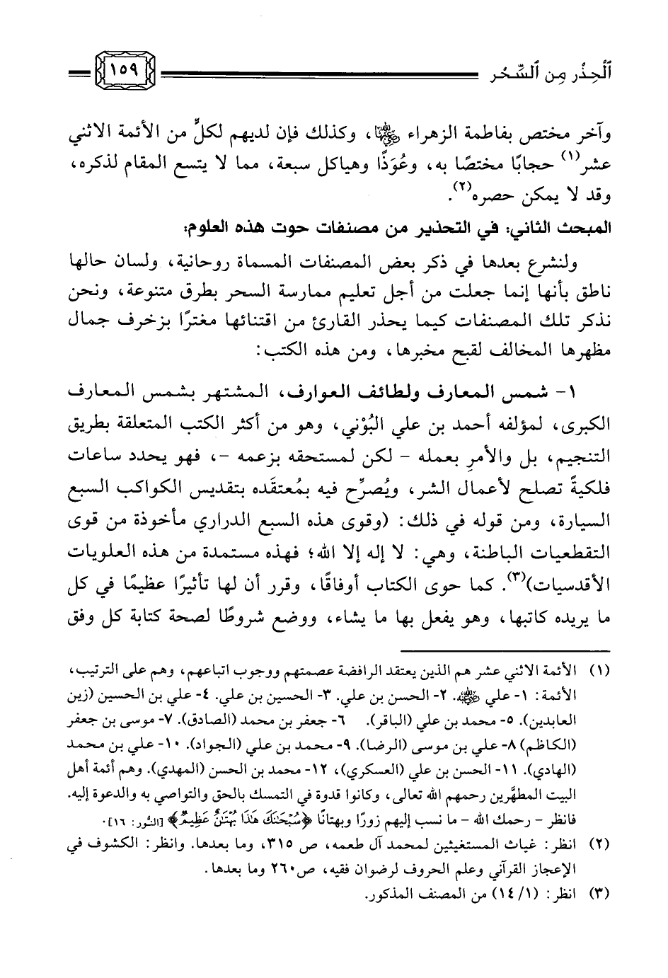 إلى ما هنالك من طامات أطّت بها القصيدة وحُقّ لها أن تئطَّ، فما نوعُ شركٍ إلا وله قد حَوَتْ!! مع هذا كله، فإن البوني يبارك هذه القصيدة، ويذكر أن خواصها لا تحصى وتصاريفها لا تستقصى!! ثم يأمر طالبَ السحر بقراءة هذه الدعوة - وهي 360 بيتًا كما سبق - سبع مرات، وأحيانًا ثمان وعشرين مرة في جلسة واحدة، لا يفصل بينها سوى تأدية الفرائض من الصلاة!! ونحن نقول لهؤلاء: أما كان كتاب الله تعالى هو الأحق بالتلاوة والحفظ والتدبر من جلجوتيتكم هذه؟! أما كانت أسماء الله الحسنى أحق بأن يدعى بها من هذه الألفاظ المعجمة التي في بِرْهتيتكم تلك؟! فيا من اقتنى مثل هذه الكتب هلاّ بادرت إلى إتلافها، فإن العمر فرصة ثمينة لإعماره بطاعة الله تعالى، وهو
