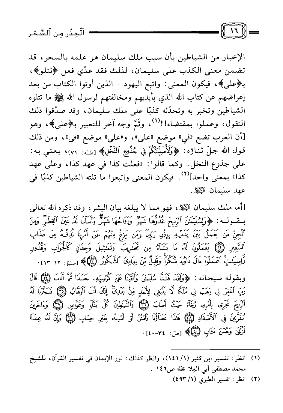 الإخبار من الشياطين بأن سبب ملك سليمان هو علمه بالسحر، قد تضمن معنى الكذب على سليمان، لذلك فقد عدّي فعل {تتلو} ، بـ {على} ، فيكون المعنى: واتبع اليهود - الذين أوتوا الكتاب من بعد إعراضهم عن كتاب الله الذي بأيديهم ومخالفتهم لرسول الله صلى الله عليه وسلم ما تتلوه الشياطين وتخبر به وتحدّثه كذبًا على ملك سليمان، وقد صدّقوا ذلك التقول، وعملوا بمقتضاه!! (¬1) ، وثَمَّ وجه آخر للتعبير بـ {على} ، وهو [أن العرب تضع «في» موضع «على» ، و «على» موضع «في» ، ومن ذلك قول الله جلّ ثناؤه: [طه: 71] {وَلأَُصَلِّبَنَّكُمْ فِي جُذُوعِ النَّخْلِ} ، يعني به: على جذوع النخل. وكما قالوا: «فعلت كذا في عهد كذا، وعلى عهد كذا» بمعنى واحد] (¬2) . فيكون المعنى واتبعوا ما تلته الشياطين كذبًا في عهد سليمان عليه السلام.