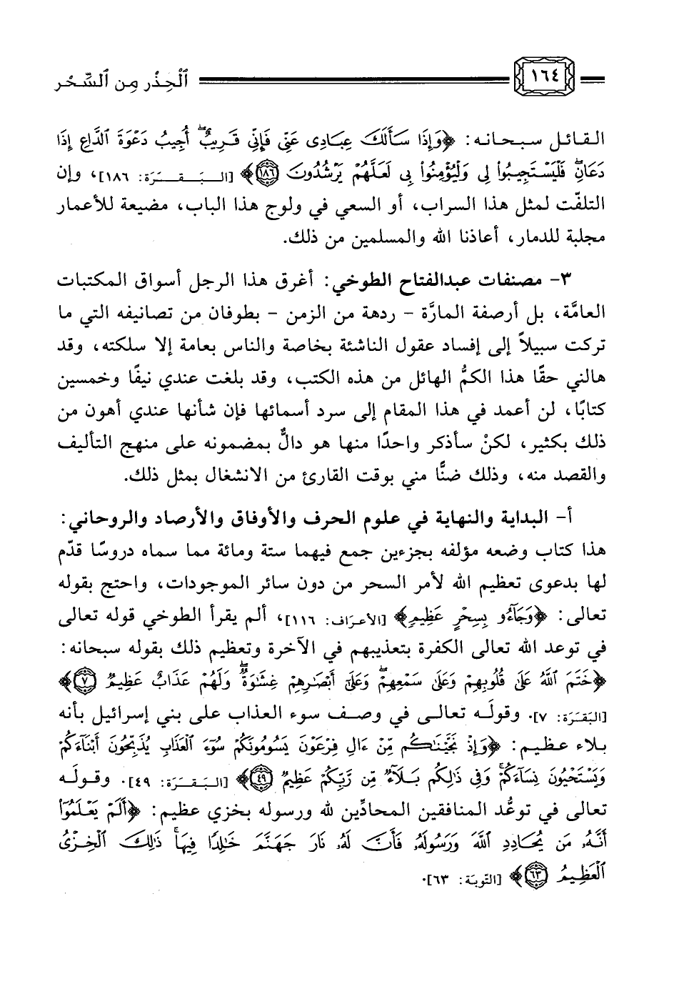 ولنعد بعدها إلى هذه المجربات والفوائد لنجد أن عامة ما ذكر فيها من خصائص الآيات والسور لم تصح، ثم إن التصرفات بها بكتابتها على هيئات مخصوصة، ككتابة في إناء زجاج ثم محوها بماء ورد، أو على شقفة طين نيئة لم تحرق، ثم سحق الطين، وخلطه مع تراب من مقبرة قديمة وتراب آخر من دار خربة، ثم رش ذلك في موضع دار عدوٍّ لخرابه يوم السبت، كل ذلك مما يُستشف منه نوع استهزاء بآيات الله تعالى، وإن لم يكن ذلك فالبدع المُضِلَّة، وإلا فهل تستعمل آيات القرآن من قوله تعالى: [هُود] {فَلَمَّا جَاءَ أَمْرُنَا جَعَلْنَا عَالِيَهَا سَافِلَهَا وَأَمْطَرْنَا عَلَيْهَا حِجَارَةً مِنْ سِجِّيلٍ مَنْضُودٍ *مُسَوَّمَةً عِنْدَ رَبِّكَ وَمَا هِيَ مِنَ الظَّالِمِينَ بِبَعِيدٍ *} . هل يعقل أن تكون سببًا في إصابة امرئ بحمى، إن رسمت في قدر باسم شخص مع شيء من أثره، ويجعل القدر على نار حتى يغلي فالمعمول له تأخذه الحمى من حينه ووقته، هذا ما قاله الديربي فهل من نفعٍ يفوق هذا النفع من مجرباته؟! كما حوى كتابه تلك الأشكال السبعة - المذكورة آنفًا - وأنها مجربة النفع أيضًا، وهكذا فهو كتاب غلب عليه الدلالة على أعمال سحرية مجربة، لا شأن لها ألبتة بالرقى الشرعية أو بخصائص السور وفضائل