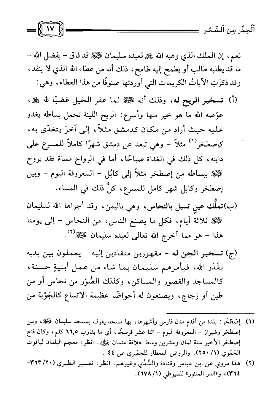 (أ) ... تسخير الريح له، وذلك أنه عليه السلام لما عقر الخيل غضبًا لله عز وجل، عوّضه الله ما هو خير منها وأسرع: الريح اللينة تحمل بساطه يغدو عليه حيث أراد من مكان كدمشق مثلاً، إلى آخرَ يتغدّى به، كإصطخر (¬1) مثلاً - وهي تبعد عن دمشق شهرًا كاملاً للمسرع على دابته، كل ذلك في الغداة صباحًا، أما في الرواح مساءً فقد يروح عليه السلام ببساطه من إصطخر مثلاً إلى كابُل - المعروفة اليوم - وبين إصطخر وكابل شهر كامل للمسرع، كلُّ ذلك في المساء.