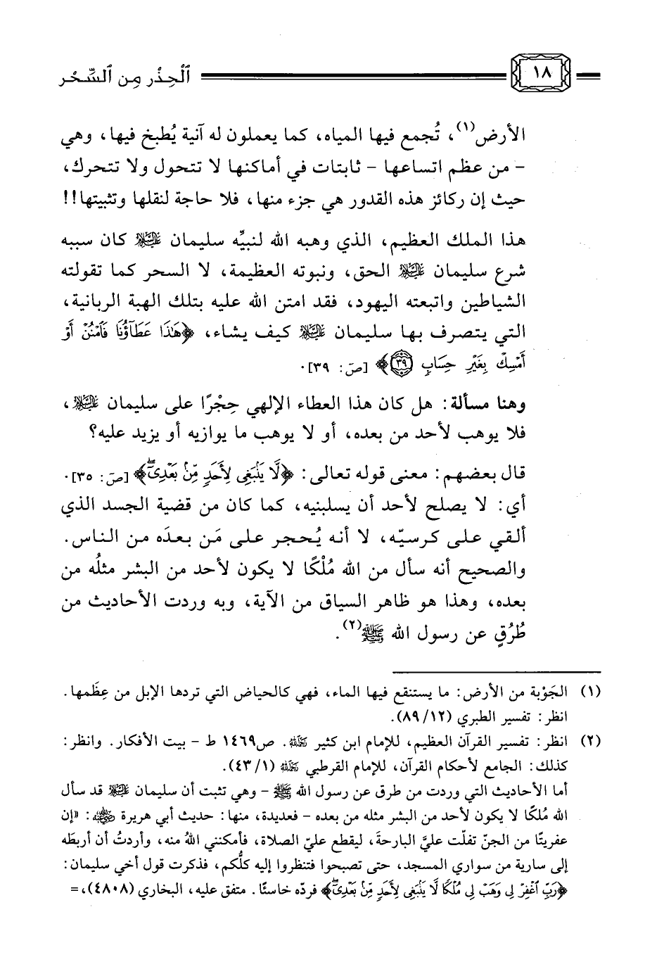 قال بعضهم: معنى قوله تعالى: [ص: 35] {لاَ يَنْبَغِي لأَِحَدٍ مِنْ بَعْدِي} . أي: لا يصلح لأحد أن يسلبنيه، كما كان من قضية الجسد الذي ألقي على كرسيّه، لا أنه يُحجر على مَن بعدَه من الناس. والصحيح أنه سأل من الله مُلْكًا لا يكون لأحد من البشر مثلُه من بعده، وهذا هو ظاهر السياق من الآية، وبه وردت الأحاديث من طُرُقٍ عن رسول الله صلى الله عليه وسلم (¬2) .