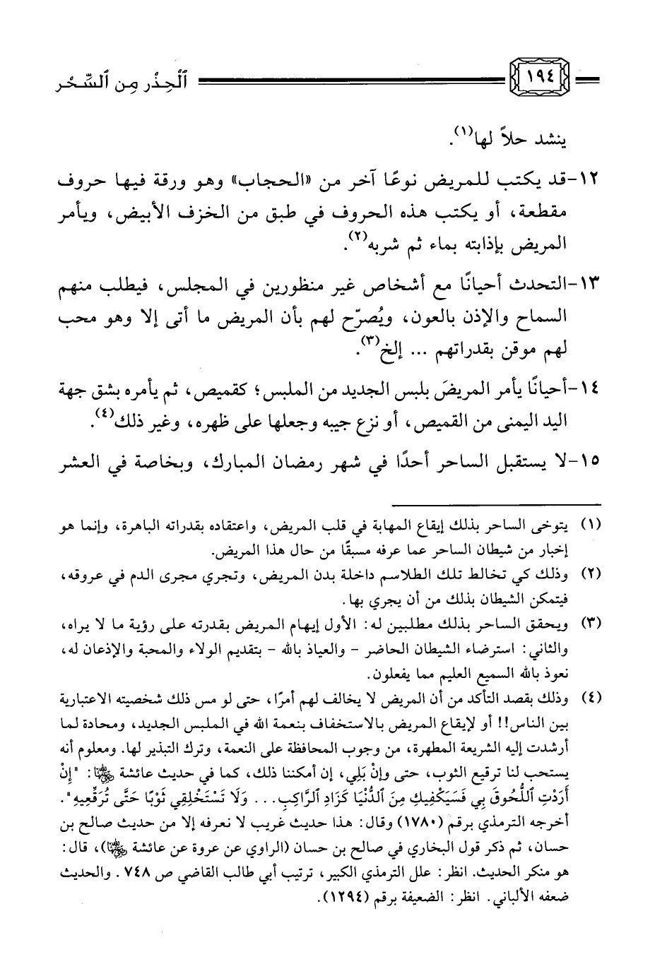 أخي القارئ، تلك هي - بإجمال - العلامات الدالّة على الساحر، والأعراض التي يستشف من خلالها المعالج احتمال وجود سحر على المريض، فيعمد عندها إلى استخراجه وإبطاله، - إن أمكن معرفة موضعه - أو الاحتجام، أو بالتداوي بعجوة المدينة، ويكون ذلك مترافقًا مع الرَّقْي المشروع، فإن عولج المريض بمثل ما سبق، ولم يكتب له شفاء به، عدنا إلى الاستطباب العضوي، أو النفسي، [ولا بد من الإشارة في هذا المقام إلى أن كثيرًا من الناس يعتقد أن الأدوية في العلاج لدى الطبيب النفسي ما هي إلا جرعات مسكّنة منوِّمة تسلك بالمريض سبيل الإدمان، وهذا اعتقاد خاطئ عند تعميمه، حيث إن الأدوية النفسية لا تؤدي إلى ذلك، باستثناء مجموعة صغيرة منها كبعض أدوية القلق، إذا ما استخدمت لفترات طويلة وبدون إشراف طبي مباشر من طبيب حاذق أمين. وكذلك فإن اعتقاد البعض أن الطب النفسي ليس إلا جلسات كلامية، لذا فلا حاجة - باعتقادهم - إلى العلاج النفسي، وهذا بدوره اعتقاد خاطئ، فإن العلاج النفسي غير الدوائي ليس مجرد حوار يجريه الطبيب مع مريضه، إنما هو حوار مقنّن يتبع منهجًا علميًا وبرنامجًا خاصًا، يقوم المختص فيه بما يسمونه (علاجًا مساندًا) يُطمئن فيه المريض ويُوجِّهه، ومن ثم يشرع بعلاجه سلوكيًا، فيجتهد في تعديل بعض السلوكيات المَرَضِيّة مع استبدالها بأخرى مناسبة، ثم يعمد إلى العلاج المعرفي فيصحح فيه بعض أساليب التفكير الخاطئة لدى المريض مع استبدالها بأساليب صحيحة، وهكذا بتدرجٍ إلى أن يعمد الطبيب إلى الدواء، أو - في حالات متقدمة - إلى علاجات جراحية محدّدة. وبالإجمال فإن التداوي النفسي ليس وصمة عار تلحق بالمريض، بل هو نمط علمي للعلاج قد يُخلِّص المريض من أعراض عضوية يرتبط ظهورها ارتباطًا وثيقًا بمرض نفسي (¬1) ، فضلاً عن
