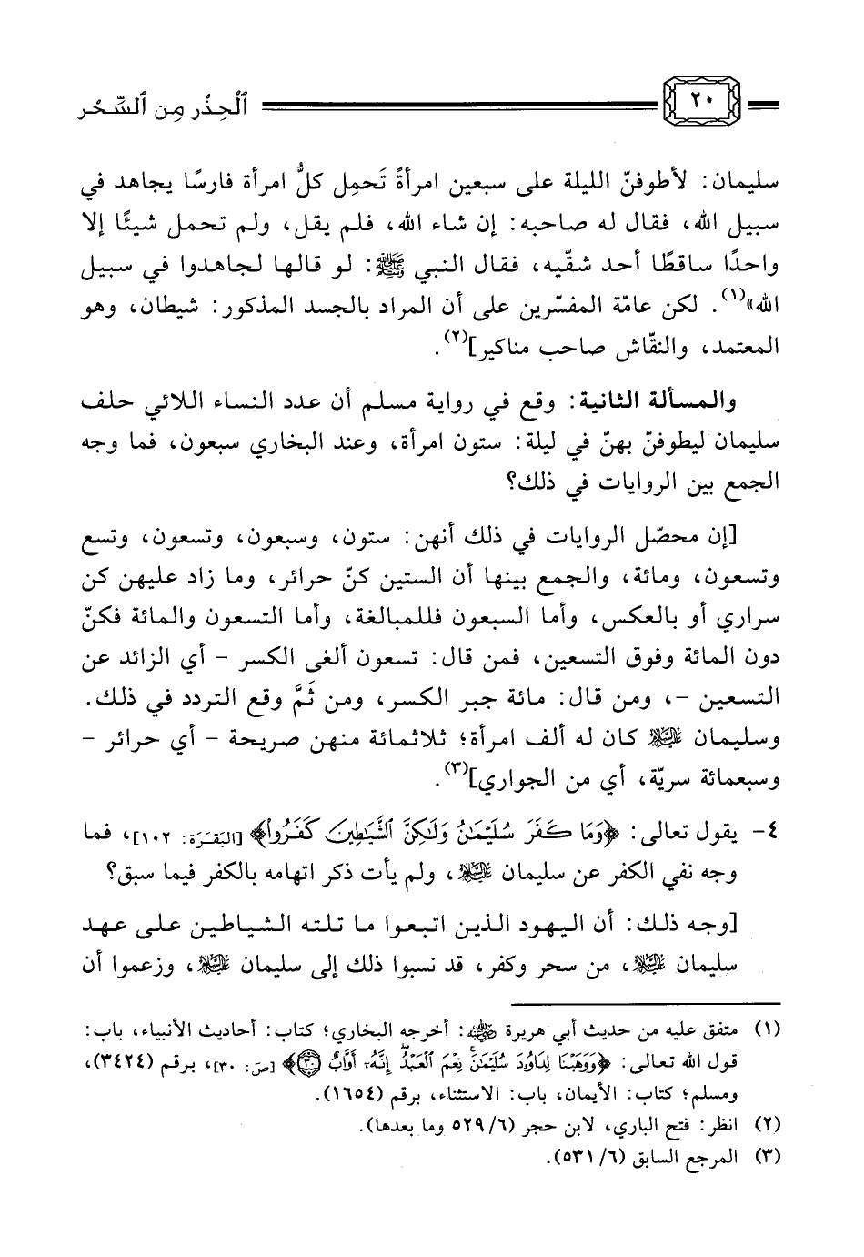 والمسألة الثانية: وقع في رواية مسلم أن عدد النساء اللائي حلف سليمان ليطوفنّ بهنّ في ليلة: ستون امرأة، وعند البخاري سبعون، فما وجه الجمع بين الروايات في ذلك؟