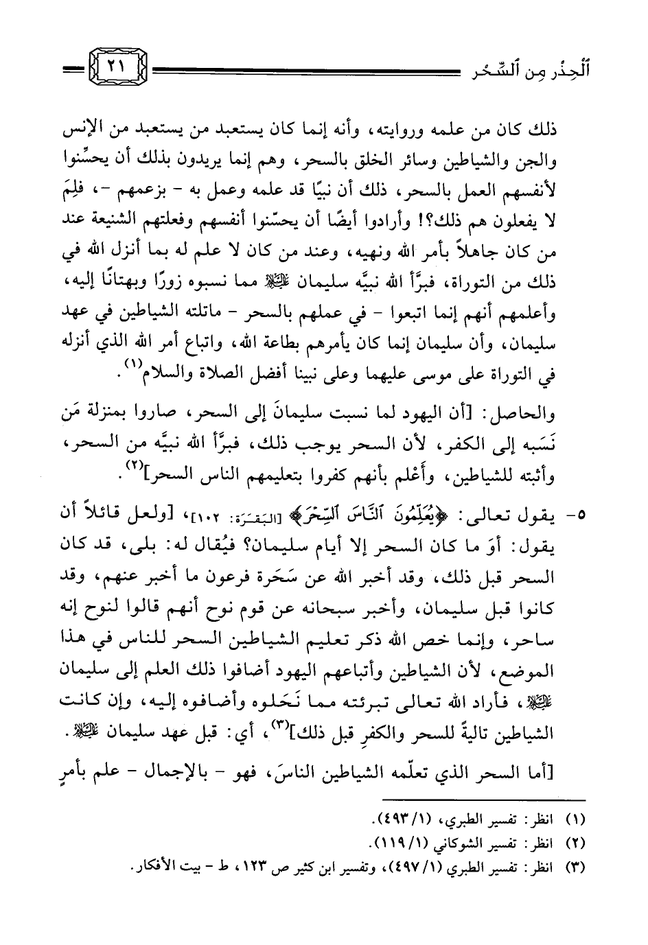 ذلك كان من علمه وروايته، وأنه إنما كان يستعبد من يستعبد من الإنس والجن والشياطين وسائر الخلق بالسحر، وهم إنما يريدون بذلك أن يحسِّنوا لأنفسهم العمل بالسحر، ذلك أن نبيًا قد علمه وعمل به - بزعمهم -، فلِمَ لا يفعلون هم ذلك؟! وأرادوا أيضًا أن يحسّنوا أنفسهم وفعلتهم الشنيعة عند من كان جاهلاً بأمر الله ونهيه، وعند من كان لا علم له بما أنزل الله في ذلك من التوراة، فبرَّأ الله نبيَّه سليمان عليه السلام مما نسبوه زورًا وبهتانًا إليه، وأعلمهم أنهم إنما اتبعوا - في عملهم بالسحر - ماتلته الشياطين في عهد سليمان، وأن سليمان إنما كان يأمرهم بطاعة الله، واتباع أمر الله الذي أنزله في التوراة على موسى عليهما وعلى نبينا أفضل الصلاة والسلام (¬1) .