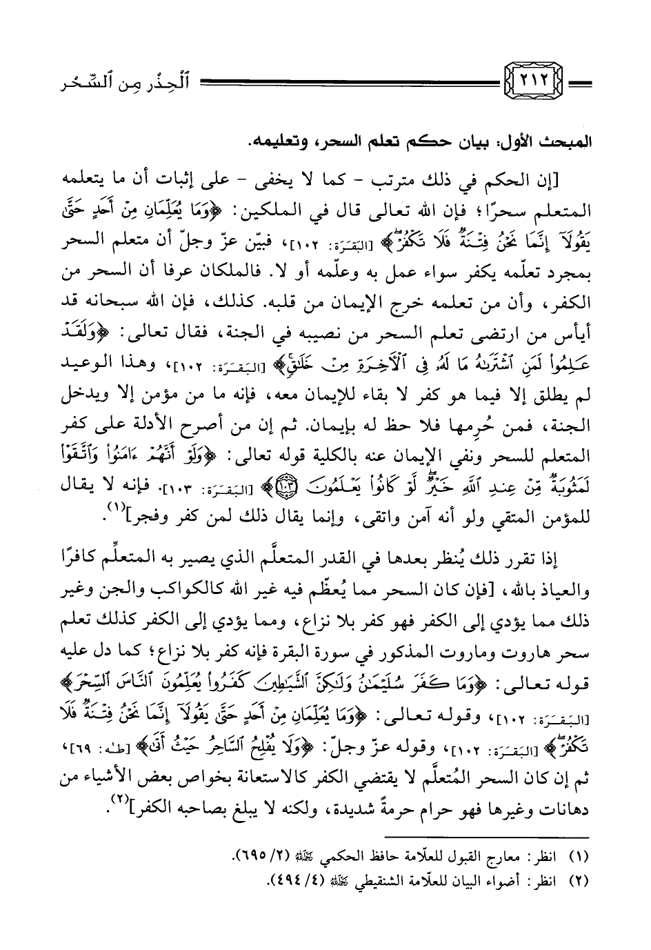 هذا ويقول ابن قدامة المقدسي رحمه الله: (تعلم السحر وتعليمه حرام على المذهب الصحيح، لا نعلم فيه خلافًا بين أهل العلم) (¬3) . ويقول النووي رحمه الله: (تعلّمُ السحر حرام على المذهب الصحيح، وبه قطع الجمهور، كالفلسفة والشعبذة والتنجيم وعلوم الطبائعيين وكل ما كان سببًا لإثارة الشكوك) ، ويقول أيضًا: ويحرم تعلمه وتعليمه لقوله تعالى: [البَقَرَة: 102] {وَلَكِنَّ الشَّيَاطِينَ كَفَرُوا يُعَلِّمُونَ النَّاسَ السِّحْرَ} ، فذمّهم على تعليمه، لأن تعلّمه يدعو إلى فعله وفعله محرّم، فحرم ما يدعو إليه (¬4) . هذا وقد يكون من أصرح ما يدل على علة تحريم تعلّم السحر، ما تنبّه إليه العلاّمة الشنقيطي رحمه الله، بقوله: (اعلم أن الناس قد اختلفوا في تعلم السحر من غير عمل به،