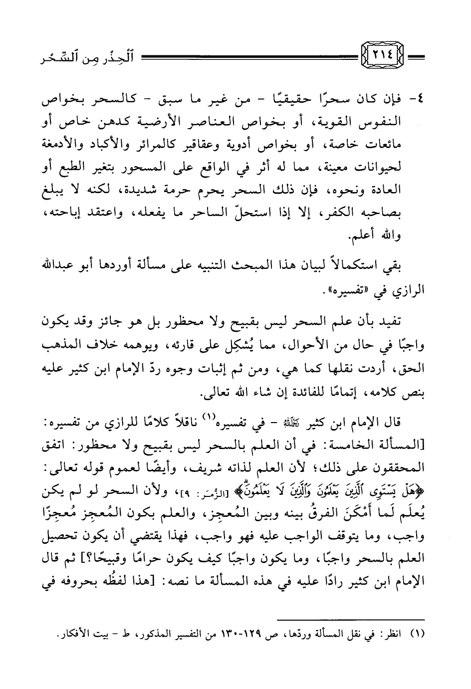 بمجرده لا تستلزم منعًا، كمن يعرف كيفية عبادة أهل الأوثان للأوثان، لأن كيفية ما يعمله الساحر إنما هي حكاية قول أو فعل، بخلاف تعاطيه والعمل به. وأما الثاني - أي: تعلم السحر بقصد إزالته عمن وقع فيه - فإن كان لا يتم كما زعم بعضهم إلا بنوع من أنواع الكفر أو الفسق فلا يَحِلّ أصلاً، وإلا جاز للمعنى المذكور، وهذا فصل الخطاب في هذه المسألة (¬1) . اهـ. فإن عبارة الإمام الأخيرة المفيدة لجواز تعلم السحر إن لم يشتمل على كفر أو فسق بقصد إزالة السحر عن المسحور قد يُشكِل فهمُها على ظاهرها، إلا أن الإمام رحمه الله قد بيّن مراده بهذا، في باب (هل يستخرج السحر) ، فذكر أن الجواز المذكور هو تعلم النشرة، وأنها على نوعين منها ما يكون بالرقى والأدعية والتعويذ، ومنها النشرة التي هي من عمل الشيطان، وهي المشتملة على تعلّم نوع من أنواع السحر. وأن حكم تعلم الأخيرة يختلف بقصد المتعلم، فمن قصد خيرًا فخير؛ وإلا فهو شر. ومع هذا البيان، فقد ذكر العلاّمة الشنقيطي بعد أن ساق كلام الإمام ابن حجر هذا ردًا مقتضبًا هاك نصه: (قوله - أي بجواز تعلم السحر إن لم يشتمل على نوع كفر أو فسق - خلاف التحقيق، إذ ليس لأحد أن يبيح ما صرّح الله بأنه يضر ولا ينفع، مع أن تعلمه قد يكون ذريعة للعمل به، والذريعة إلى الحرام يجب سَدّها، هذا هو الظاهر لنا، والعلم عند الله تعالى] (¬2) . اهـ.