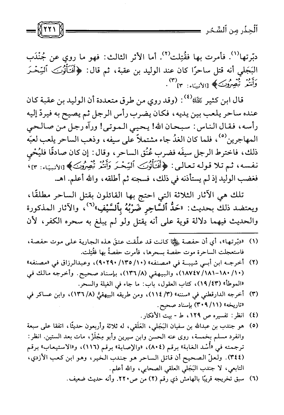 (¬2) ما يجدر ذكره هنا أن من أهل العلم من ذهب إلى عدم قتل الساحر جملة! يقول ابن حزم رحمه الله رادًا على القائلين بقتل الساحر: (فَنَظَرُنا أن يكون لهم في الآية - أي آية السحر من سورة البقرة (102) - مُتعلَّق أصلاً، ولا في شيء من القرآن، ولا من السنن الصحاح، ولا في السنن الواهية، ولا في إجماعٍ، ولا في قول صاحب، ولا في قياس، ولا نظر، ولا رأيٍ سديد يصح، بل كل هذه الوجوه مبطلة لقولهم. انظر: المحلَّى (8/399) .