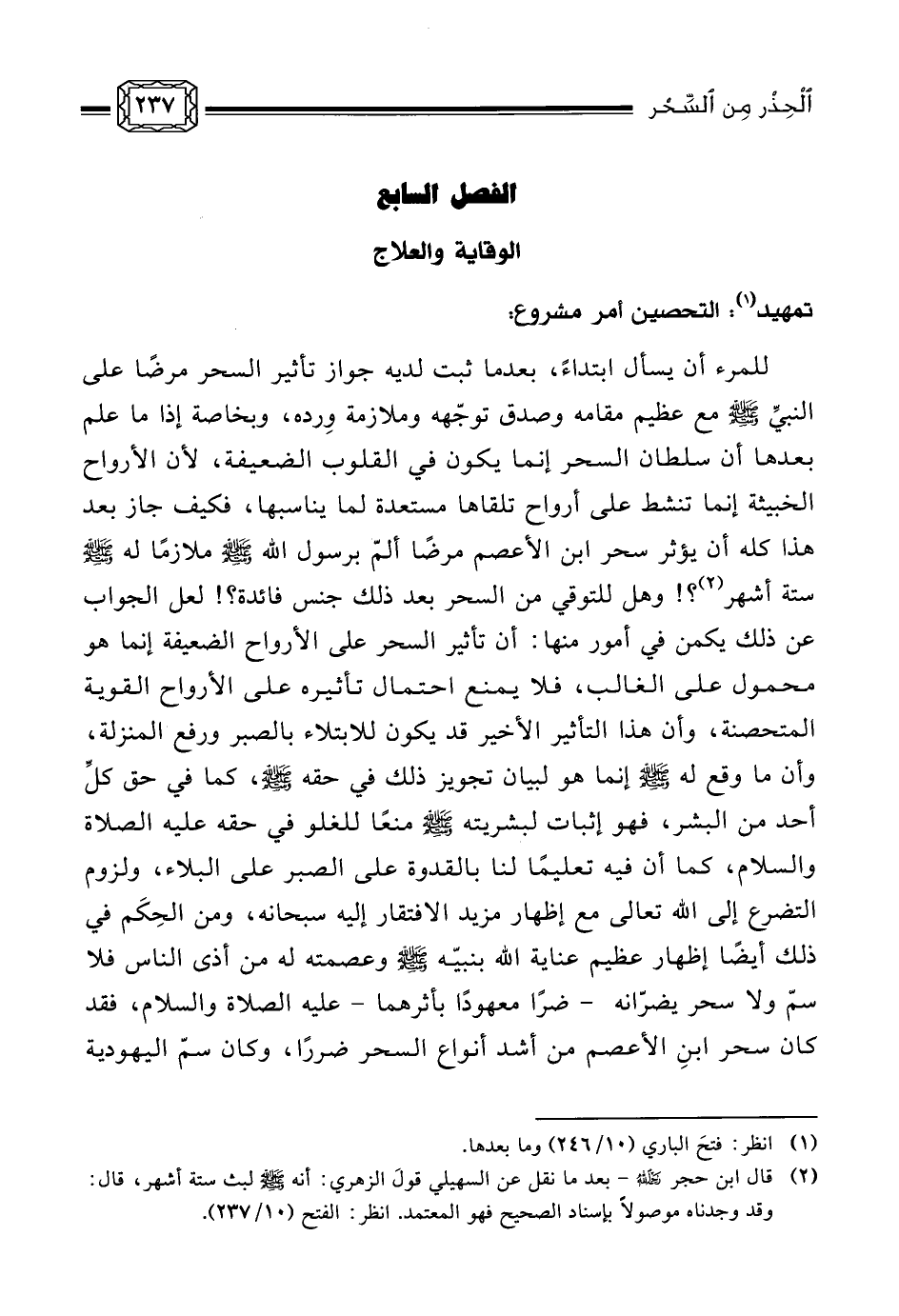 فانظر - رعاك الله - إلى عظم شأن هذا الحصن، وإلى عجز إبليس وجنده، وضعفهم عن مجرد إغواء من اتصف بالإخلاص، فكيف لساحر بعدها - وهو خادم صاغر لشيطانه - أن يقارب مؤمنًا بضرٍّ، أو يُنزِل به شرًا؟! أما رأيت كيف تجتنب الشياطين طريقًا مرّ بها عمر رضي الله عنه كما أعلمه به المعصوم صلى الله عليه وسلم: «وَالَّذِي نَفْسِي بِيَدِهِ، مَا لَقِيَكَ الشَّيْطَانُ قَطُّ سَالِكًا فَجَّاَ إِلاَّ سَلَكَ فَجًّا غَيْرَ فَجِّكَ» (¬1) بل أضحى الشيطان يرتعد خوفًا من إخلاص عمر رضي الله عنه وقوته في الحق، كما بشّر به رسول الله صلى الله عليه وسلم عمرَ بقوله: «إَنَّ الشَّيْطَانَ لَيَخَافُ مِنْكَ يَا عُمَرُ» (¬2) .