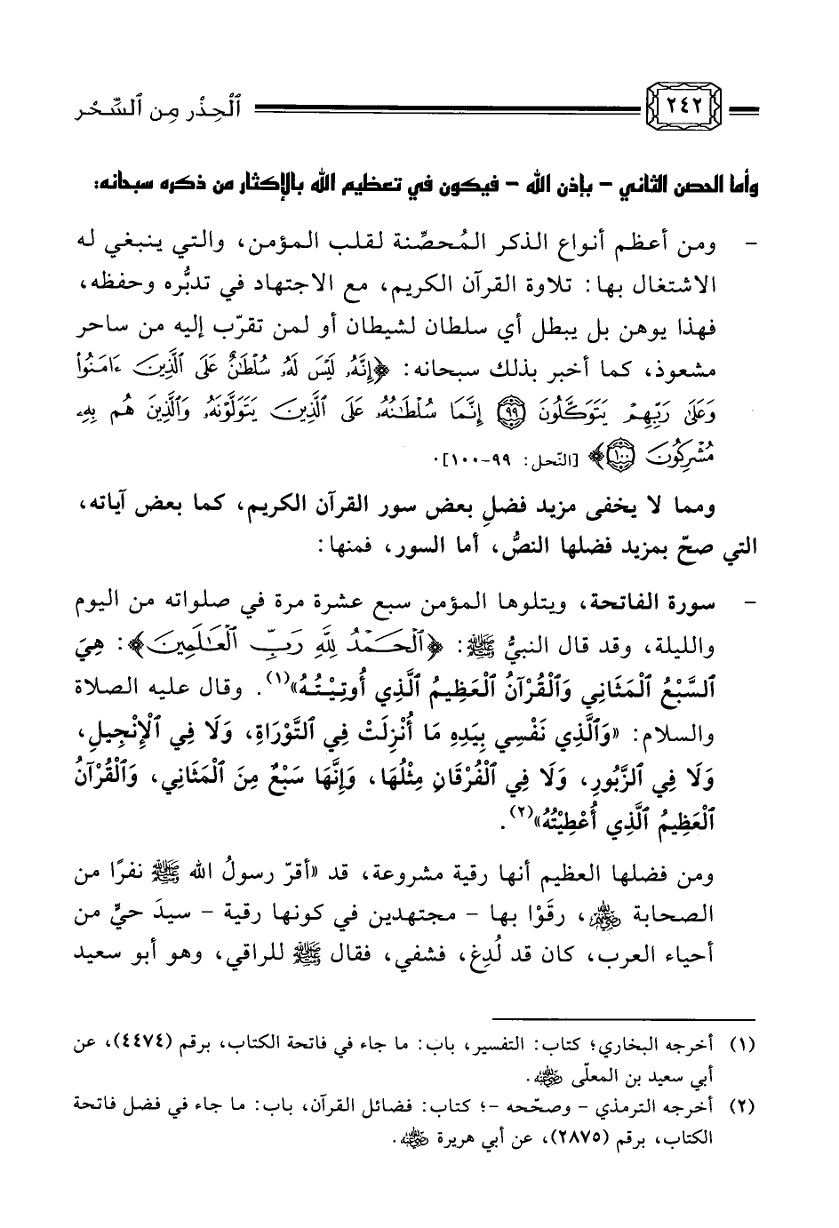- ... ومن صنوف الشرور العظمى التي يتحصن المسلم منها فتنة (المسيح الدجّال) ، ويكون ذلك التحصن بحفظ عشر آيات من أول سورة الكهف، وعشرٍ من آخرها. وذلك لقوله صلى الله عليه وسلم: «مَنْ حَفِظَ عَشْرَ آيَاتٍ مِنْ أَوَّلِ [مِنْ آخِرِ] سُورَةِ الْكَهْفِ عُصِمَ مِنَ الدَّجَّالِ» (¬3) .