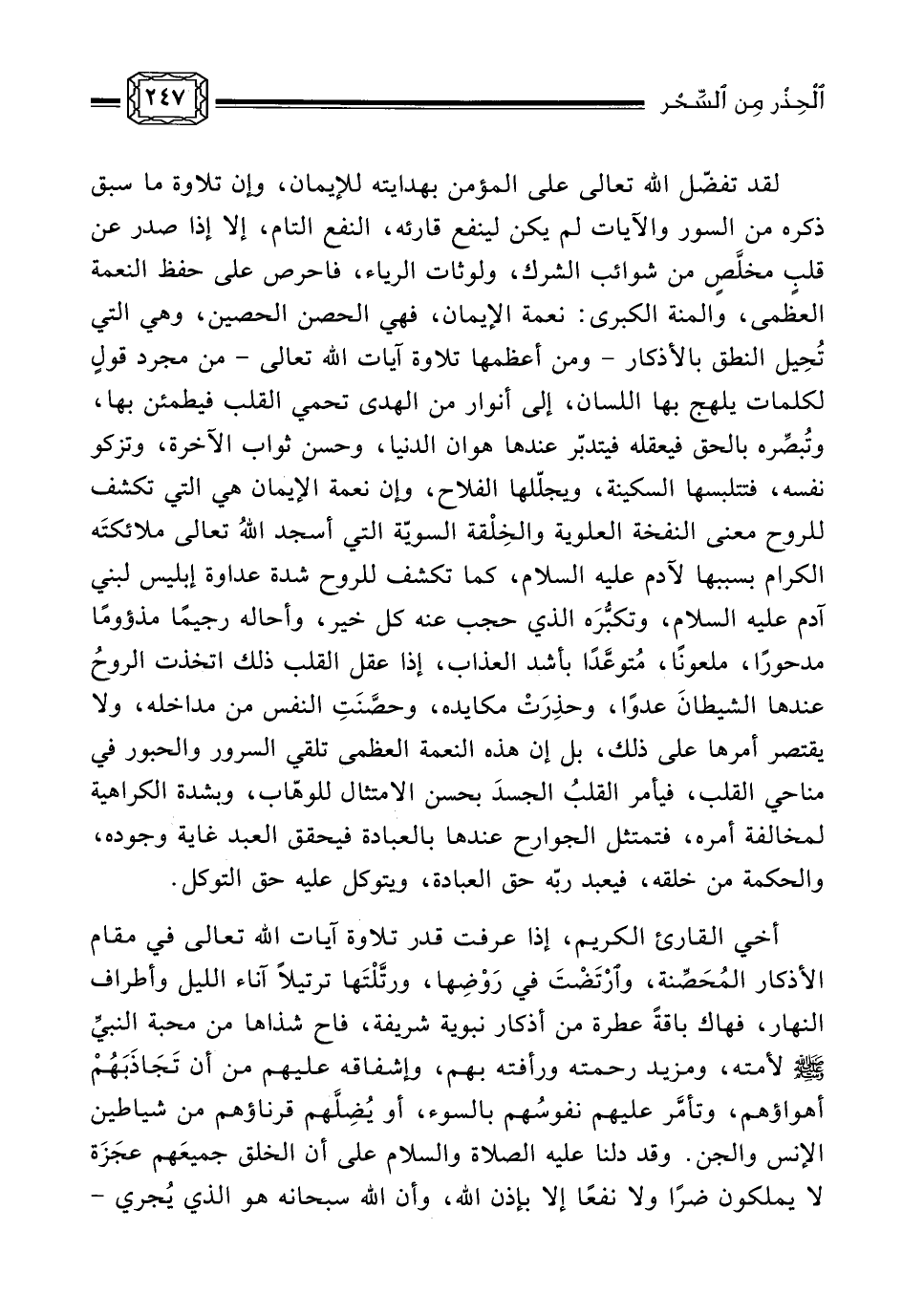 بمثلهما، ويستحب أن يقرأ بهما في صلاة الصبح (¬1) ، وكذلك في أدبار الصلوات (¬2) ، وحين الإصباح والإمساء مع سورة الإخلاص ثلاث مرارٍ - كما مرّ آنفًا -، كما يقرأ المؤمن بذلك جميعه وينفث بهما في كفيه إذا أوى إلى فراشه، ويتعوذ بهما عند شكايته المرض، ويرقي بهما نفسه عند نزول المرض، كل ذلك اقتداءً بالنبيِّ صلى الله عليه وسلم (¬3) .