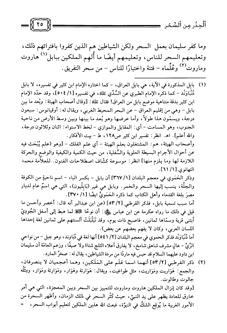 (¬1) بابِل المذكورة في الآية، هي بابل العراق، - كما اختاره الإمام ابن كثير في تفسيره، لا بابل دُنْبَاوَنْد - كما ذكره الإمام الطبري عن السُّدِّي رحمه الله، في تفسيره [1/504] ، وقد حدّد الإمام ابن كثير بدقة متناهية موضع بابل من العراق! فقال رحمه الله: [وقال أصحاب الهيئة: وبُعد ما بين بابل - وهي من إقليم العراق - عن البحر المحيط الغربي، ويقال له: أوقيانوس: سبعون درجة، ويسمّون هذا طولاً، وأما عرضها وهو بُعد ما بينها وبين وسط الأرض من ناحية الجنوب، وهو المسامت - أي: المقابل والموازي - لخط الاستواء: اثنان وثلاثون درجة، والله أعلم] . اهـ. انظر: تفسير ابن كثير ص128، ط - بيت الأفكار.