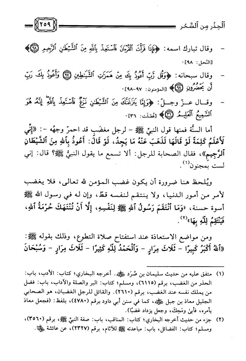 - ... هذا، ومما يحسن ختم صنوف التعوذ به، الاستعاذة بالله تعالى من أن يتسلط الشيطان على نفس المؤمن عند النزع الأخير، فيُخْتَمُ له بخاتمة السوء، عياذًا بالله، لذا فقد شُرِع لنا التعوذ بالله تعالى من ذلك، قال النبيُّ صلى الله عليه وسلم: «وَأَعُوذُ بِكَ أَنْ يَتَخَبَّطَنِيَ الشَّيْطَانُ عِنْدَ الْمَوْتِ» (¬2) .