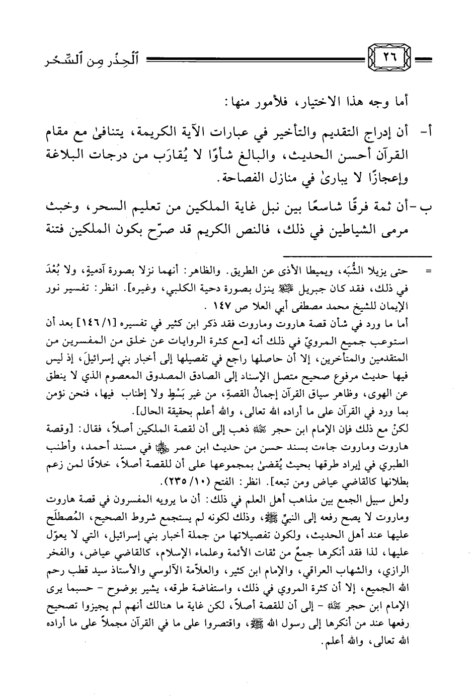 ب - ... أن ثمة فرقًا شاسعًا بين نبل غاية الملكين من تعليم السحر، وخبث مرمى الشياطين في ذلك، فالنص الكريم قد صرّح بكون الملكين فتنة