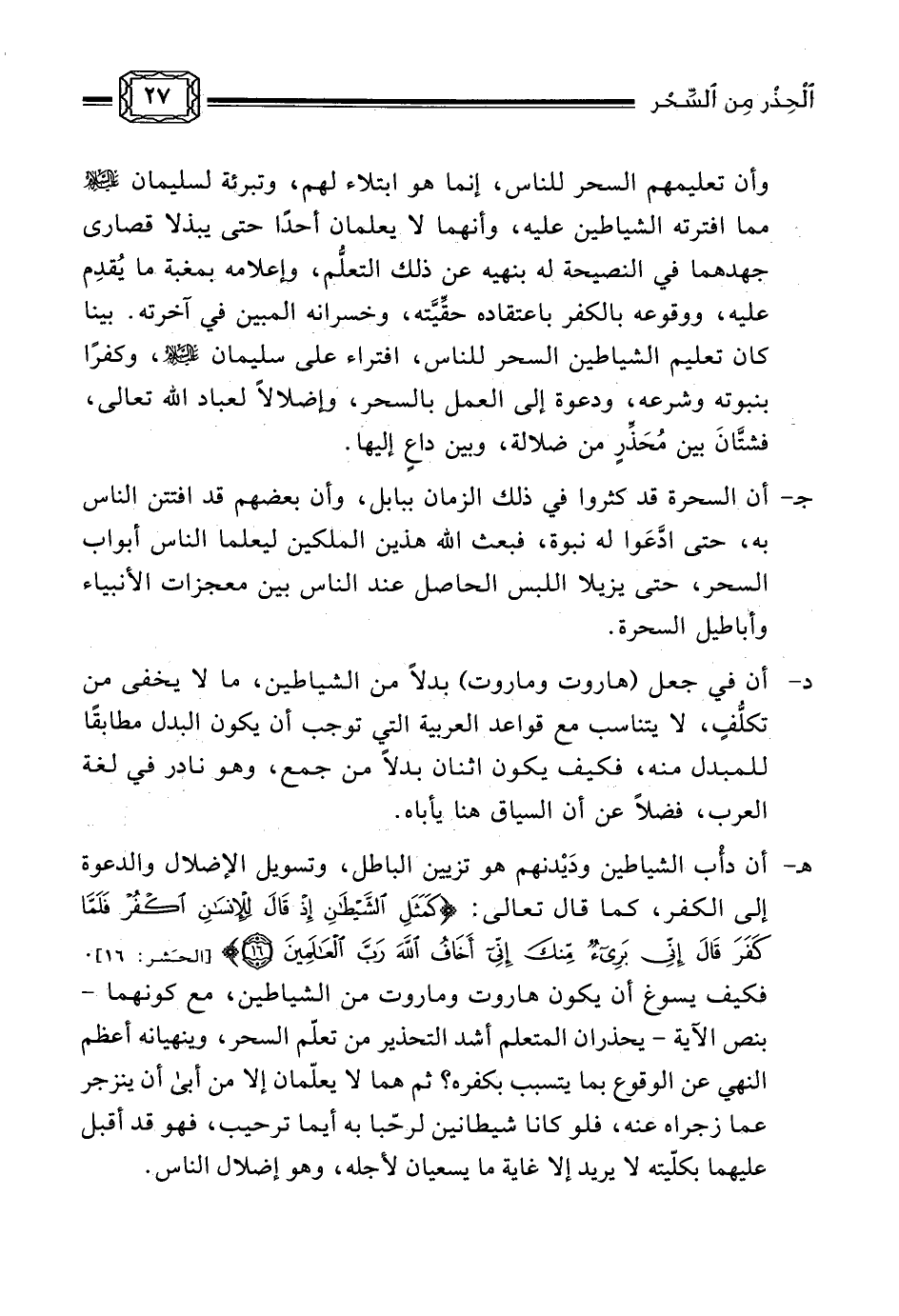 وأن تعليمهم السحر للناس، إنما هو ابتلاء لهم، وتبرئة لسليمان عليه السلام مما افترته الشياطين عليه، وأنهما لا يعلمان أحدًا حتى يبذلا قصارى جهدهما في النصيحة له بنهيه عن ذلك التعلُّم، وإعلامه بمغبة ما يُقدِم عليه، ووقوعه بالكفر باعتقاده حقِّيَّته، وخسرانه المبين في آخرته. بينا كان تعليم الشياطين السحر للناس، افتراء على سليمان عليه السلام، وكفرًا بنبوته وشرعه، ودعوة إلى العمل بالسحر، وإضلالاً لعباد الله تعالى، فشتَّانَ بين مُحَذِّرٍ من ضلالة، وبين داعٍ إليها.