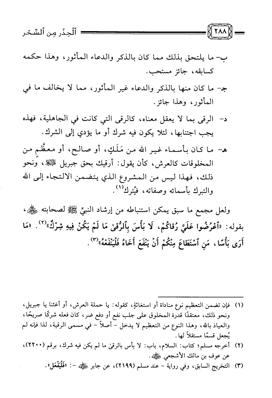 على أن الراقي لا يستحق أجرًا إلا إذا صحَّ انتفاعه بالرقية. ونحن نرى أن كثيرًا ممن عُرِفوا بالعلاج عن طريق الرقى، - للأسف البالغ - لم يفقهوا حق الفقه كلامَ النبيِّ صلى الله عليه وسلم «إِنَّ أَحَقَّ مَا أَخَذْتُمْ عَلَيْهِ أَجْرًا كِتَابُ اللهِ» (¬1) ، فأوّلوا ذلك بالتوسع في طلب الأجرة على الرقية، دونما نظر لحال المرقي، أو احتسابٍ للأجر والمثوبة عند الله تعالى في قصد نفع المسلمين، وذلك هو المشاهد من حال العديد ممن يتصدر - في عصرنا - لادعاء السبق إلى الولاية الخاصة، مع حيازته تمام التقوى والصلاح، ودفع الداء وجلب الشفاء، للعامة والخاصة!! فإلى الله المشتكى، وهو المستعان المرتجى.