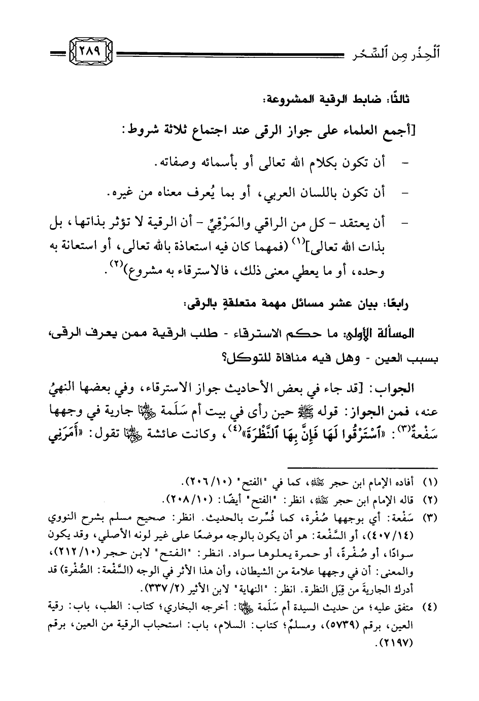 (¬4) أخرجه مسلم؛ كتاب: السلام، باب: استحباب وضع يده على موضع الألم، مع الدعاء، برقم (2202) ، وعند أبي داود، برقم (3891) ، بلفظ «اِمْسَحْهُ بِيَمِينَكَ سَبْعَ مَرَّاتٍ، وَقُلْ ... » . والترمذي برقم (2080) ، وابن ماجه برقم (3522) بلفظ: «اِجْعَلْ يَدَكَ الْيُمْنَى عَلَيْهِ، وَقُلْ ... » . عن عثمان بن أبي العاص رضي الله عنه.