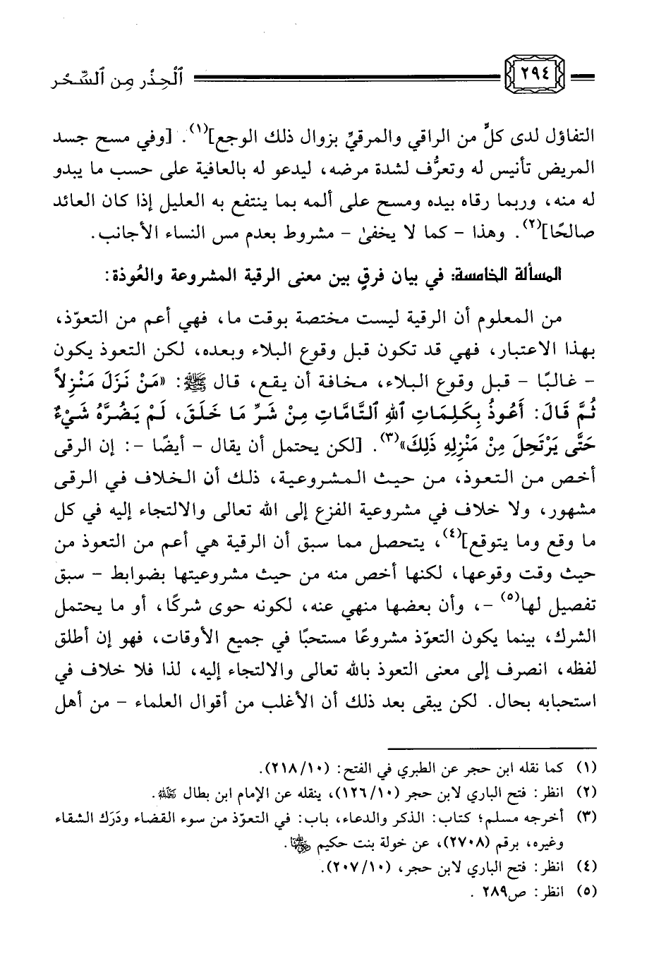 والحاصل من ذلك: أن المرض، ووقوع ضرر العين، والحسد، والسحر، والمس، لا يكون إلا بإذن الله، ُ صلى الله عليه وسلم [البَقَرَة: 102] {وَمَا هُمْ بِضَآرِّينَ بِهِ مِنْ أَحَدٍ إِلاَّ بِإِذْنِ اللَّهِ ... } . فكذلك الرقى المشروعة لا يقع نفعها إلا بإذن الله تعالى. وقد بيّن رسول الله صلى الله عليه وسلم أن الرقية هي مما قدَّره الله سببًا للنفع بإذنه، وذلك حين استشكل أبو خزامة رضي الله عنه - من بني الحارث بن سعد -