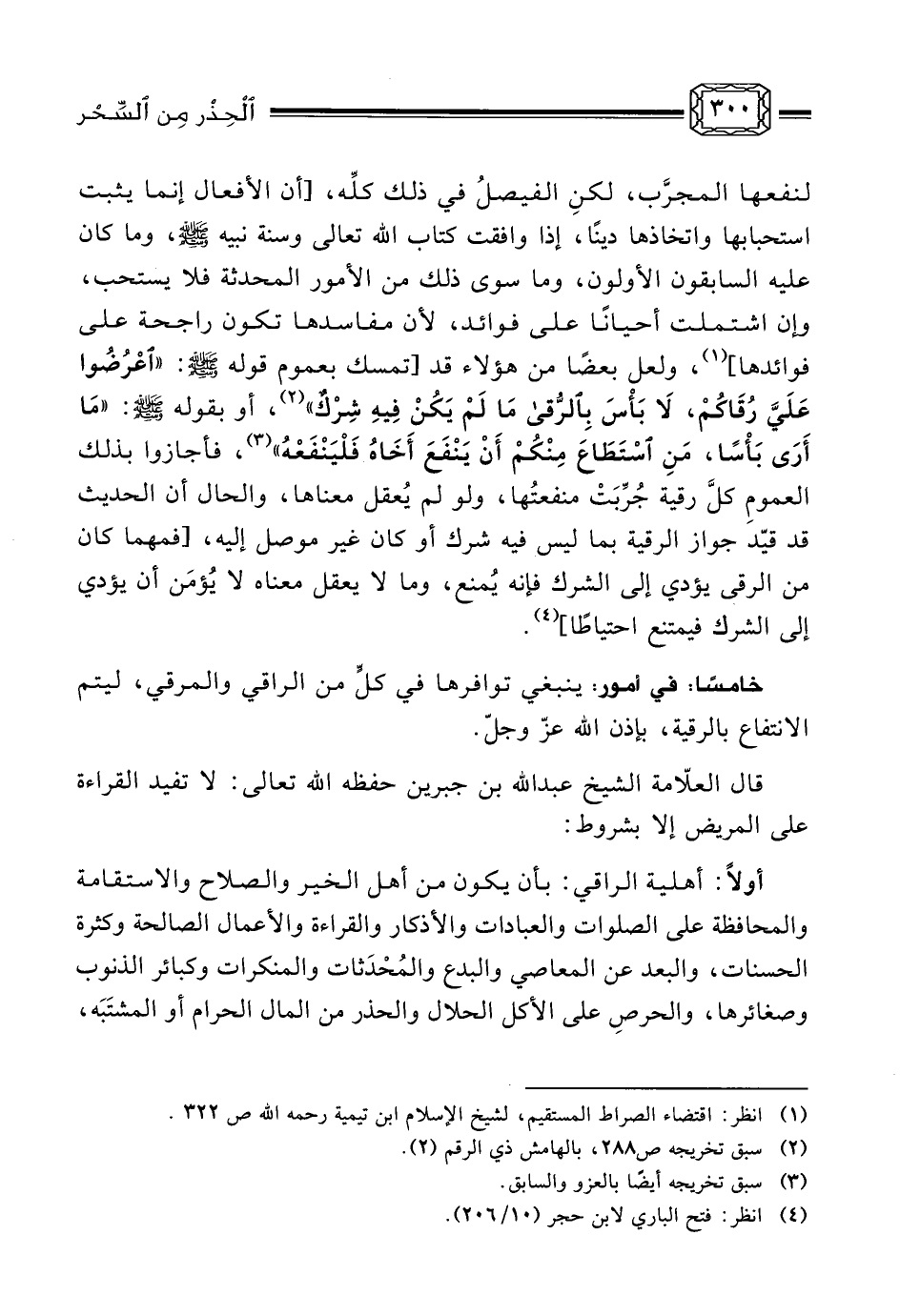 (¬1) كما أفتى به فضيلة العلاّمة ابن جبرين حفظه الله، انظر: سلسلة الفتاوى الشرعية فتاوى الرقى والتمائم، ص: 20 وص: 22. إعداد المؤلف.