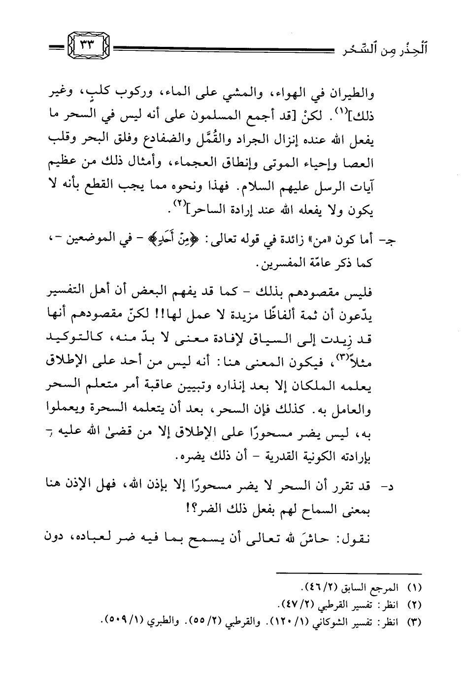 فليس مقصودهم بذلك - كما قد يفهم البعض أن أهل التفسير يدّعون أن ثمة ألفاظًا مزيدة لا عمل لها!! لكنّ مقصودهم أنها قد زِيدت إلى السياق لإفادة معنى لا بدّ منه، كالتوكيد مثلاً (¬3) ، فيكون المعنى هنا: أنه ليس من أحد على الإطلاق يعلمه الملكان إلا بعد إنذاره وتبيين عاقبة أمر متعلم السحر والعامل به. كذلك فإن السحر، بعد أن يتعلمه السحرة ويعملوا به، ليس يضر مسحورًا على الإطلاق إلا من قضى الله عليه - بإرادته الكونية القدرية - أن ذلك يضره.