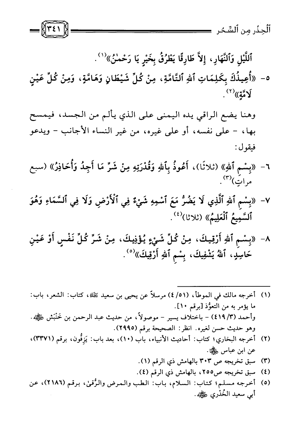 (¬4) أخرجه أحمد، في مسنده، من حديث عبد الله بن عامر رضي الله عنه، برقم (15700) . والتبريك ورد في الرواية بلفظ: «فَلْيُبَرِّكْهُ» . وهو عند الحاكم وصحَّحه، (4/215) ، وسكت عنه الذهبي. وحسّنه الألباني. انظر: «الصحيحة» برقم (2572) . ... والوَصب: دوام الوجع ولزومُه، وقد يُطلق الوَصَب على التعب والفتور في البدن. انظر: النهاية لابن الأثير (5/166) .