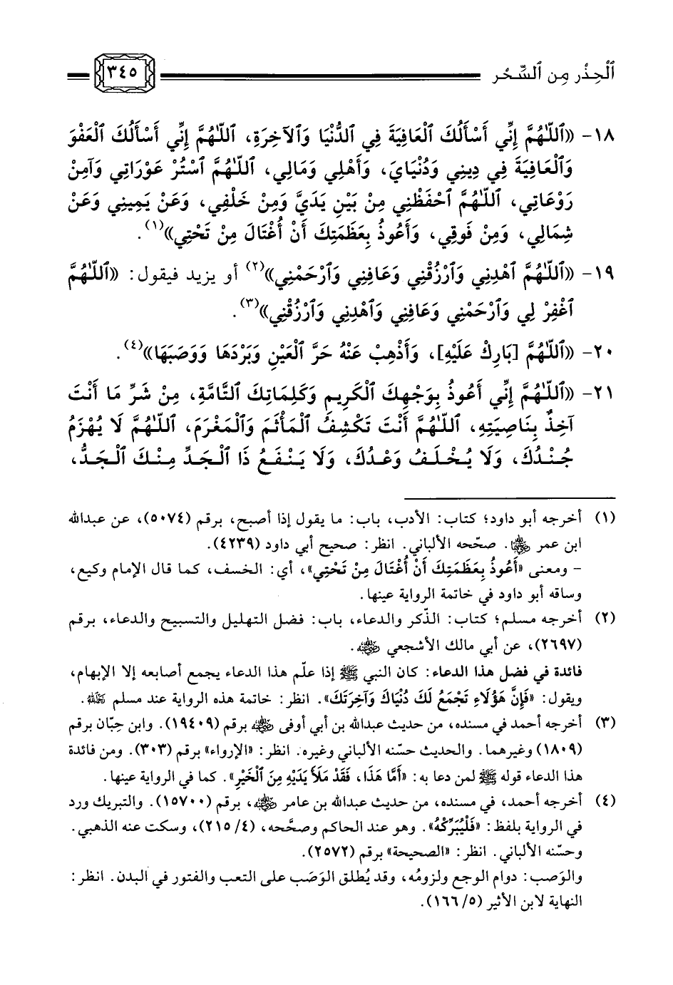 33- ... اللهُمَّ إِنَّا نَسْأَلُكَ مِنْ خَيْرِ مَا سَأَلَكَ مِنْهُ نَبِيُّكَ مُحَمَّدٌ صلى الله عليه وسلم، وَنَعُوذُ بِكَ مِنْ شَرِّ مَا اسْتَعَاذَ مِنْهُ نَبِيُّكَ مُحَمَّدٌ صلى الله عليه وسلم، وَأَنْتَ الْمُسْتَعَانُ وَعَلَيْكَ الْبَلاَغُ، وَلاَ حَوْلَ وَلاَ قُوَّةَ إِلاَّ بِاللهِ (¬2) .